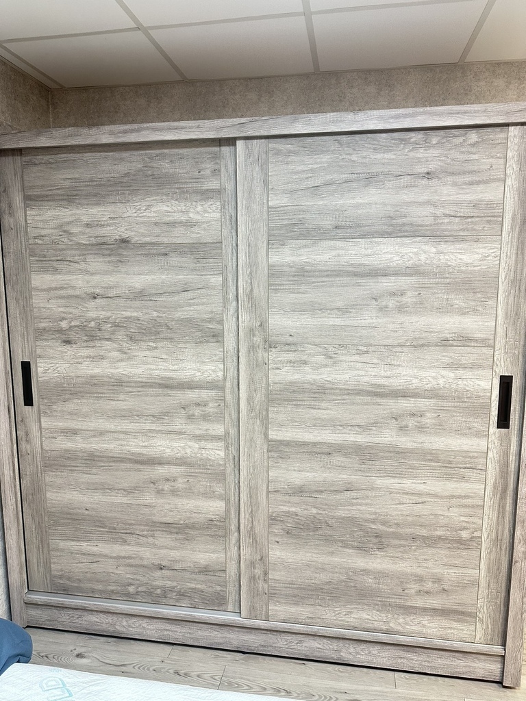▲ 258型衣櫥整體是溫潤灰木紋,雙滑門好推不卡,視覺很安定。