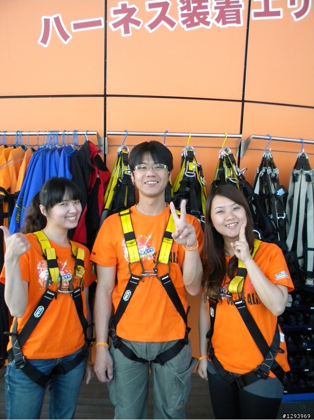 在玩空中漫步前,要先穿一些裝備在身上,我們走到穿安全吊帶的櫃檯時,看到牆上掛滿了安全吊帶,這時讓我想起我高中時的回憶
