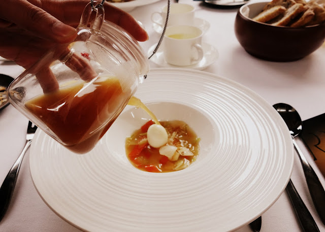 牛肉清湯、蔬菜與鵪鶉蛋。其實這道湯是整份套餐中我最不滿意的一道,因為竟然不是熱的。但這也不是冷湯啊,我問了waitress,湯是本來就要冷的喝嗎? 她說,應該是要是熱的才對。orz