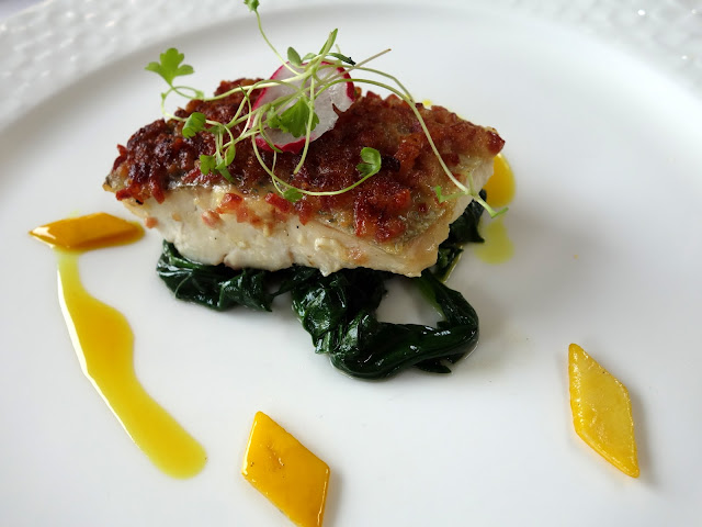 Sea Bass (海鱸魚),  Bacon Crust, Spinach, Curry Oil