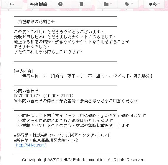 原則上,LAWSON網站會於每月月底時開放下下個月的門票預售,唯一不受三日取票的限制,就是參加正式開放下下個月門票預售的提前抽選活動,名單會於正式開賣前一天下午兩點公布,如果抽中了,就可以用之前填載的信用卡支付的方式先行預購,屆時再到當地的LAWSON取票即可(不受三日限制),不過據說中選非常難,還是請日本代購比較實際。
