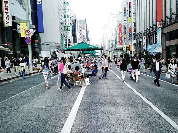 銀座的主要道路,在星期六、日中午到傍晚會被封閉,成為日語稱作「步行者天國」的行人專區。(維基)
