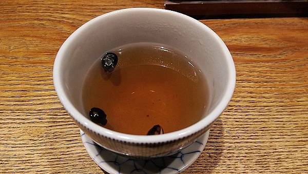 我是坐在一樓的座位,進去之後店員會先奉茶,黑豆茶可以無限量續杯。