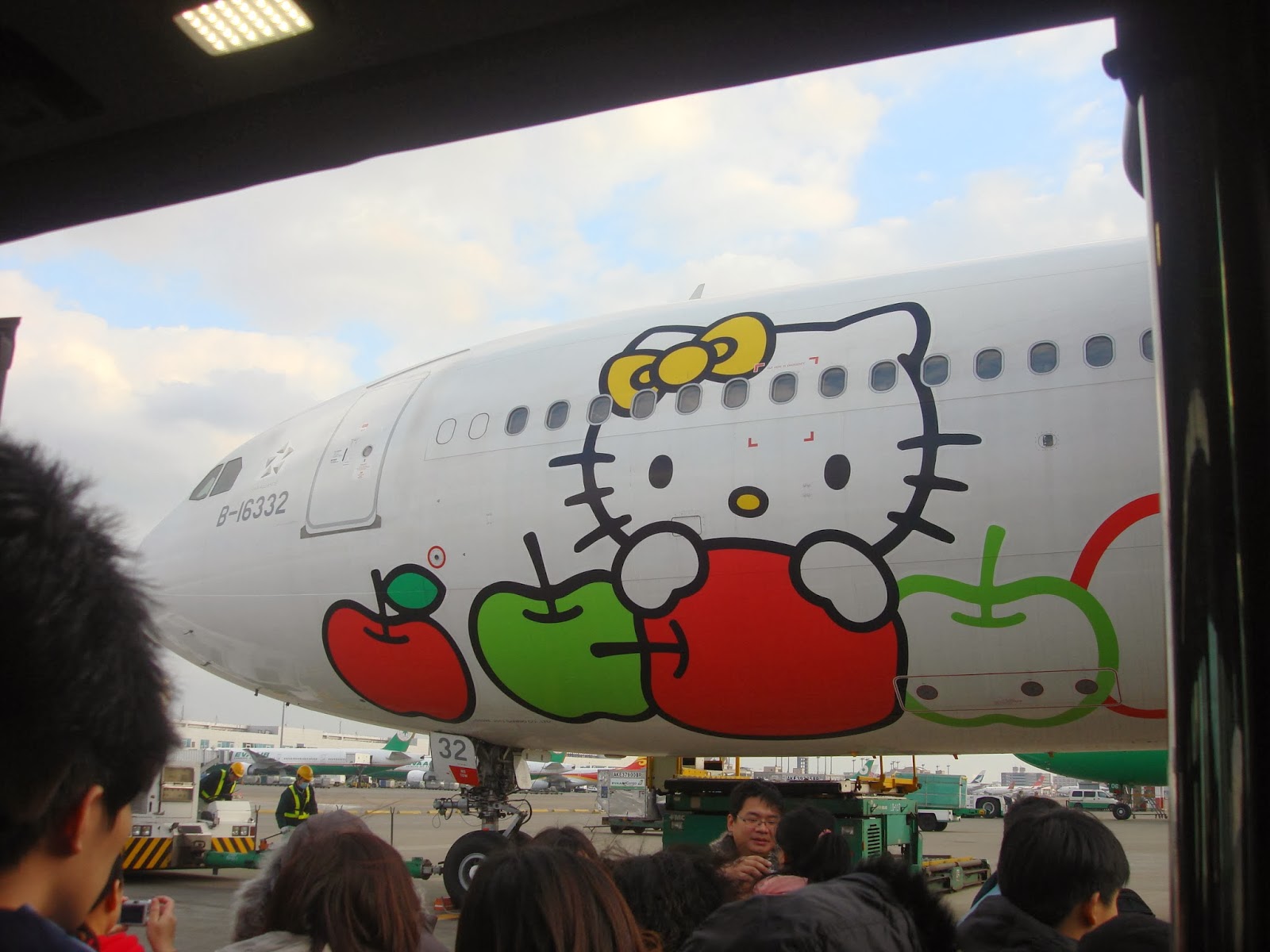 22號這天一早就起宋,把行李再次確認就直奔桃園機場二航廈,我們很幸運的搭上長榮的Hello Ketty 彩繪機,而且飛機的方式是透過巴士接到飛機下方,有機會與這隻有名的無嘴貓拍上一張照,老婆及兒子也很開心在飛機下方拍照留念。
