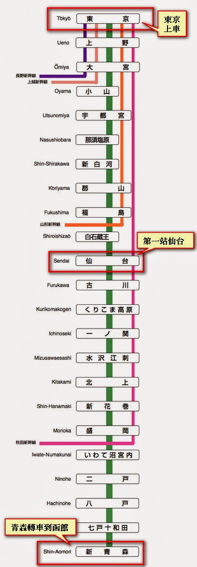 2.仙台→新青森(約1小時45分)→轉車函館(坐白鳥号約2小時到)