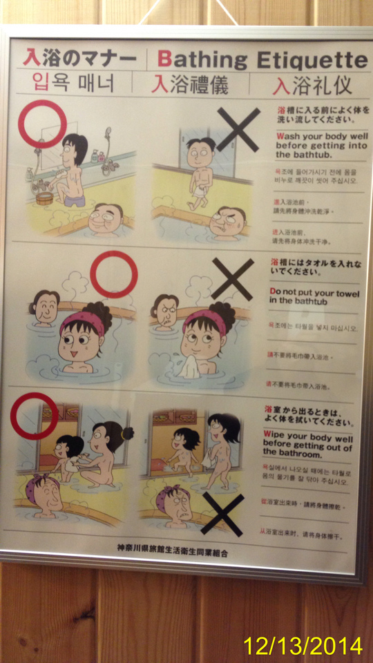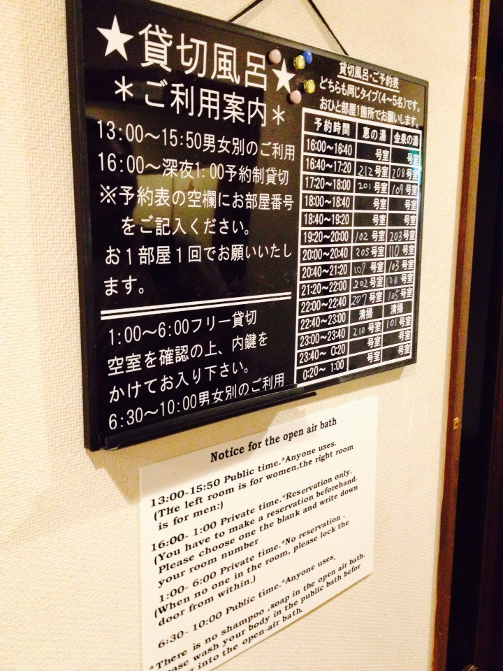一之湯在客房內雖然沒有私湯,但她的兩湯屋採預約制(13:00~15:00男女分開使用,16:00~01:00採預約制),每間客房必須事先寫下預約的時段、並在該時間內前往,也算滿隱私的:D 但好巧不巧我又那個來,來日本六次都因為同原因沒泡到湯的紀錄持續保持中。 板子上已經被預約得差不多了,我們也趕快寫下自己的房號。 泡湯禮儀用漫畫的方式表現,也太可愛了。