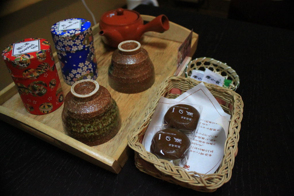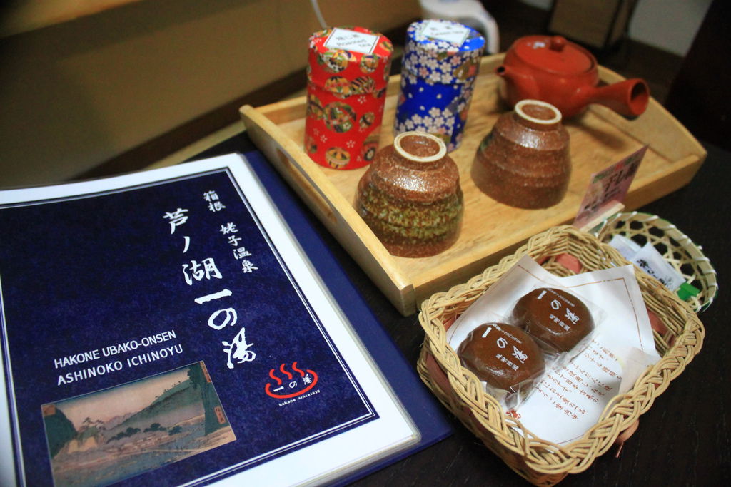 房間比我想像中的寬敞很多,雙人床前有電視跟小茶几,罐子內有抹茶和紅茶茶包,碟子上則有箱根名產"溫泉饅頭"。