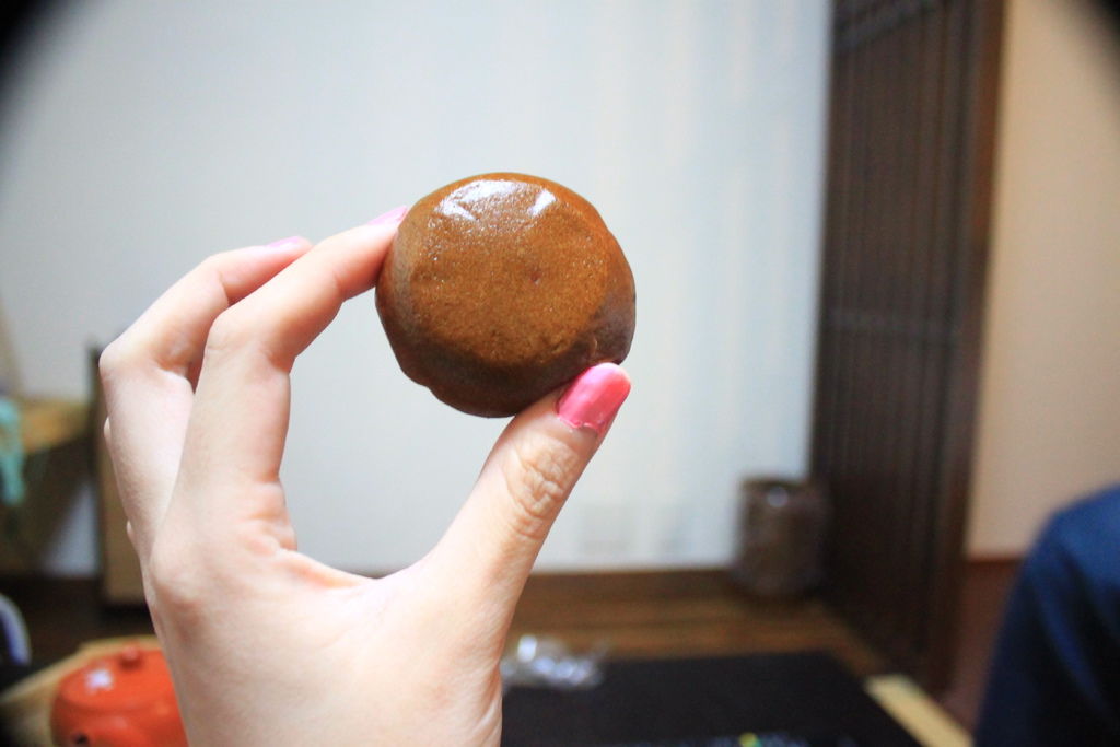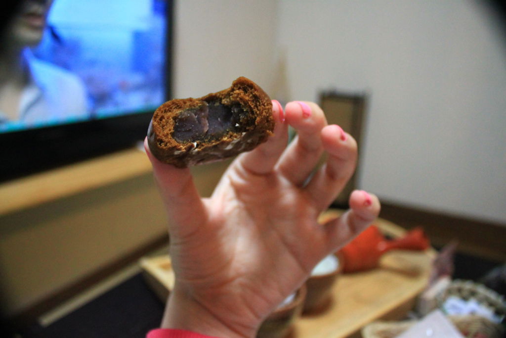 馬上我們泡起一小杯茶、尋找有趣的電視台,溫泉饅頭是我預計來要搬幾盒回台灣的特產之一,內餡是紅豆泥卻不會死甜,是很適合我們口味的和菓子(加分),小小一個兩口就沒了,大概不知不覺就會再吃掉半盒吧?