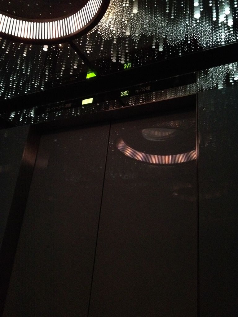 搭電梯很刺激,看著速度上升、爾壓變化也滿強烈的,不過不會痛。 電梯裡面很暗,只有燈是在發光,像個小宇宙。