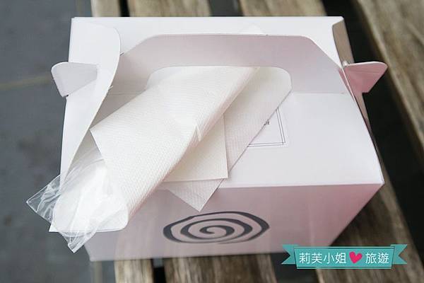 打開之後,我看到一個超級貼心的巧思,居然貼了小隔板來保護蛋糕捲不會因為走路晃動而跌倒,台灣許多甜點商家真的該效法。