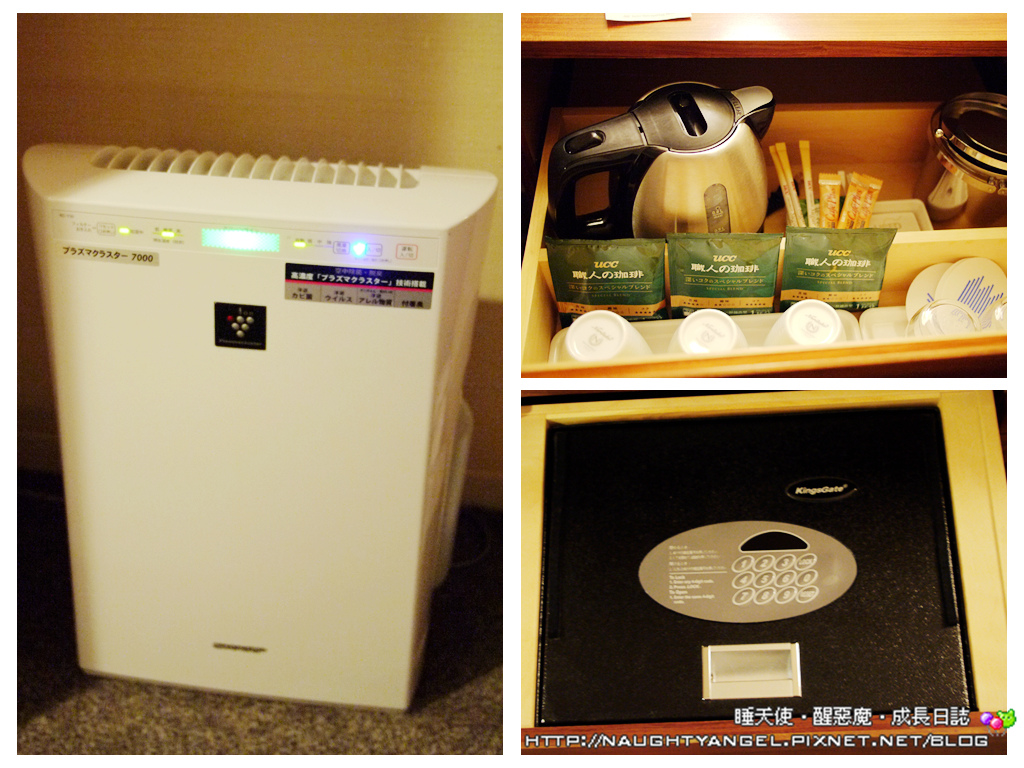房內的其他用品有清淨機+加濕器、保險箱以及濾掛式咖啡、茶等。隔天太早起來,心血來潮沖了杯咖啡,發現UCC職人咖啡好好喝柳~(剩下二包打包帶走XD)