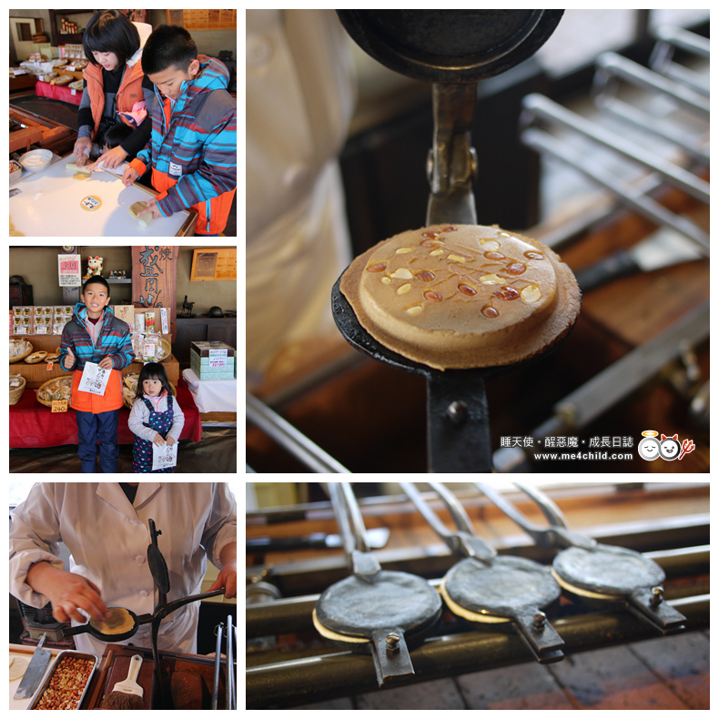 這裡的DIY費用其實都很合理不貴,我們為小吃貨先來個盛岡煎餅100円(是不是很親民的價格呀!),首先將麵皮桿成圓形放上烤架加入花生後就可以上爐子烘烤,每30秒翻面一次,翻了六次就完成了(作業步驟有中文說明)。看師傅將麵皮桿成圓形好似簡單,但實際下手後.....呃!不過自己烤的不管形狀如何,就是特別香特別好吃!
