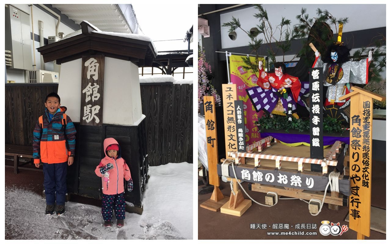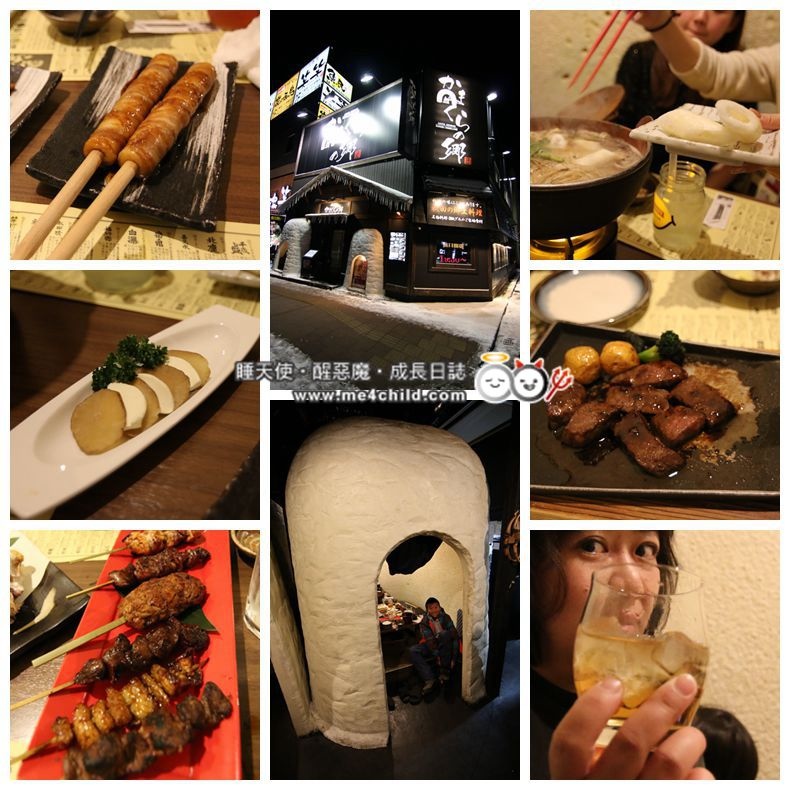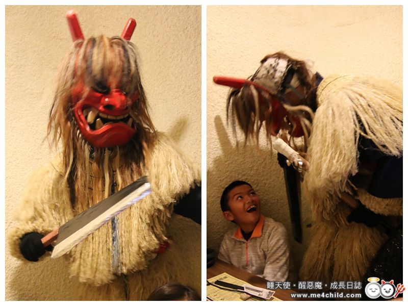 秋田真的是一個非常有特殊傳統文化的一個城市,「生剝鬼」就是其中一項傳統文化,生剝鬼分別為一男(紅)一女(藍),雖然他們長像驚人,但卻是用來警剔世人不可以懶隋、不可以做壞事,不然就會抓走(突然覺得跟媽媽告訴我的虎姑婆故事有雷同之處)。在秋田駅外走路2分鐘就到的餐廳,非常具有特色,不但用雪屋做為包廂,還會有生剝鬼表演,他衝進我們的雪屋時,林小亮的確嚇了好大一跳(有小小孩同行的要慎思),他不但長的嚇人,連聲音都哄亮的嚇人,小光的年紀不會怕,只覺得好有趣,這裡的餐點非常具有秋田特色,像是切蒲英(Kiritanpo)烤米棒及切蒲英鍋都是秋田最具代表的料理,撇除生剝鬼會嚇到小小孩之外,這裡的東西真的也好好吃!