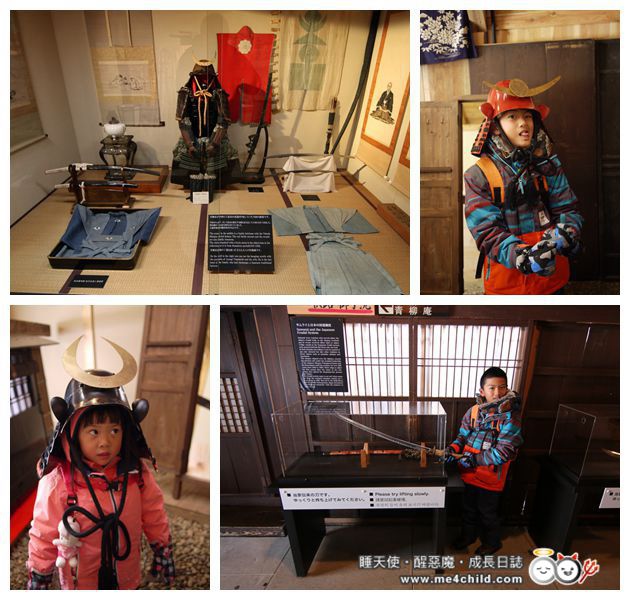 與石黑家較不同的一點是這裡的部份寶劍是可以讓人觸摸的到,感受的到那拿起寶劍的沈重及威武感,另外也有武士頭盔體驗,不知為什麼我家二隻戴上頭盔一個像消防隊一個像牛魔王的,一點都不威,不過對於這樣的體驗,讓小朋友覺得相當有趣。(全身著武士盔甲裝的體驗也有,需付費),