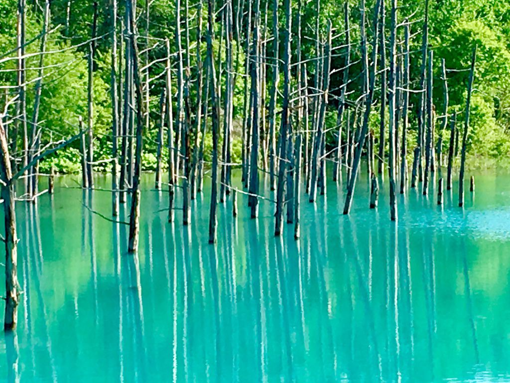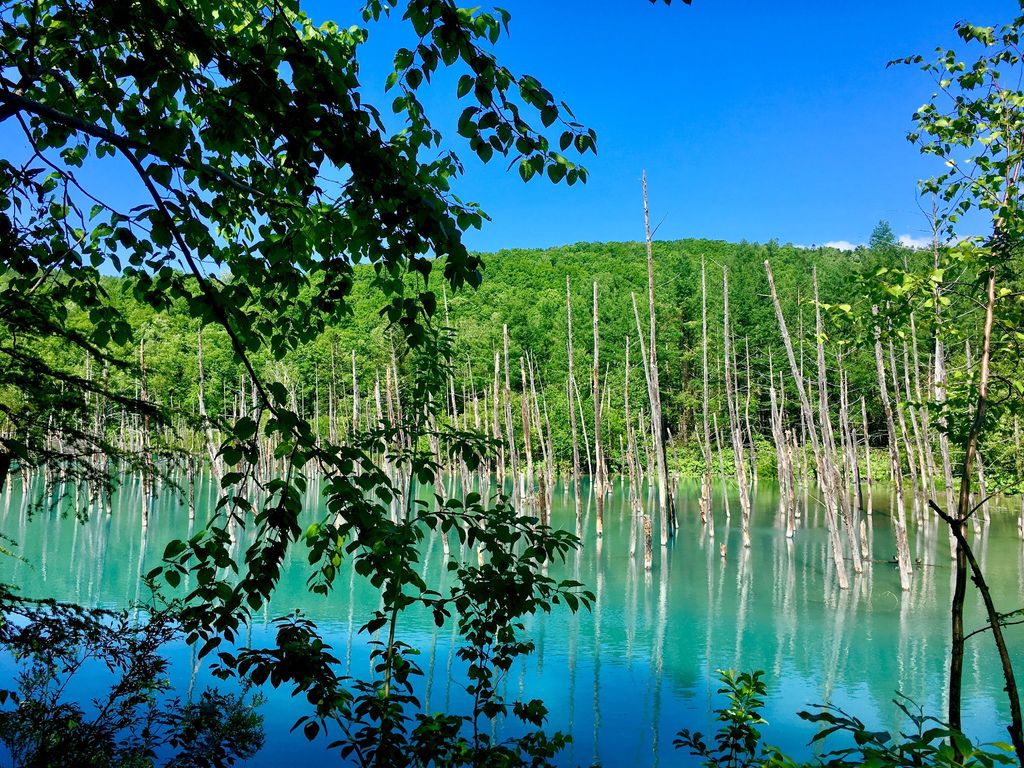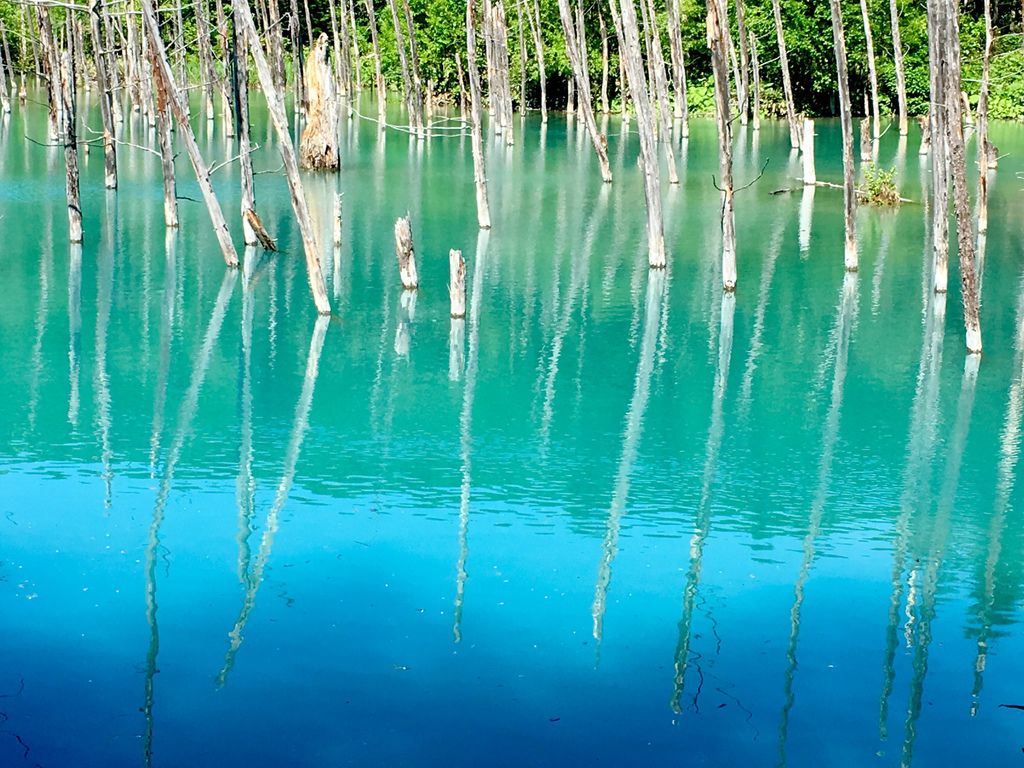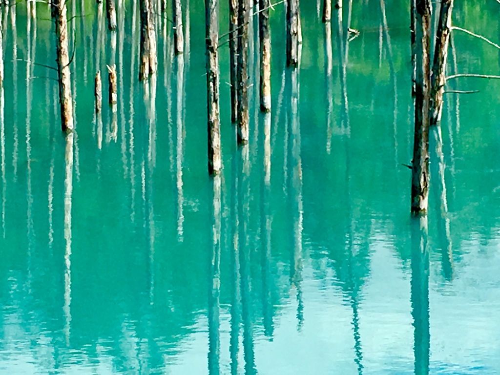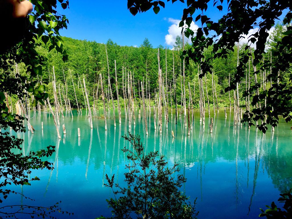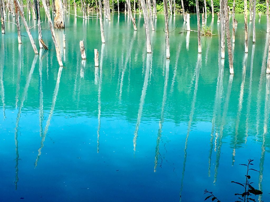 水質還很清澈,就是這幕沉在清澈水裡枯木跟我在九寨溝看到的很重疊,我好像懂了為什麼大家都說青池是北海道的九寨溝,我可以很清楚的看到樹皮的紋路。
