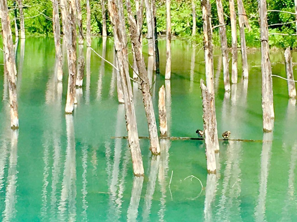兩隻小鳥停在水面浮木上,覺得它們圓圓的身體讓畫面變得可愛。 青池原本是人工種植的林區,建造防堵火山泥流的河堤後被堰塞,所以在某些角度可以看到樹木排列井然有序。