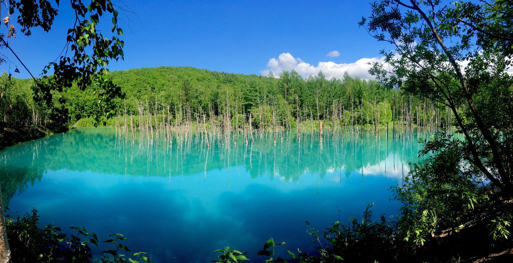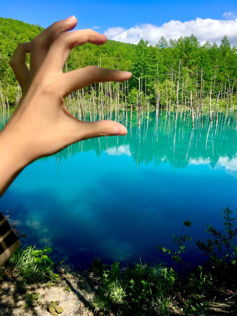 從旭川開車過來,一路經過七星樹、四季彩之丘等著名景點,青池是最裡面的一站,;出乎我意料的是這個季節在北海道開車可以看到遠方的雪山、冰河,一種無盡的遼闊讓人好放鬆。 青池在溫泉區的大路旁邊,跟著指標走很好找,停車場超大,跟著人潮走不到2min就可以走到青池邊了。