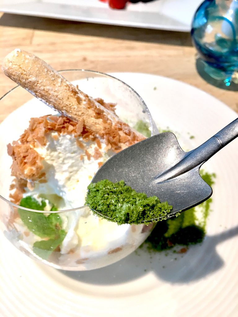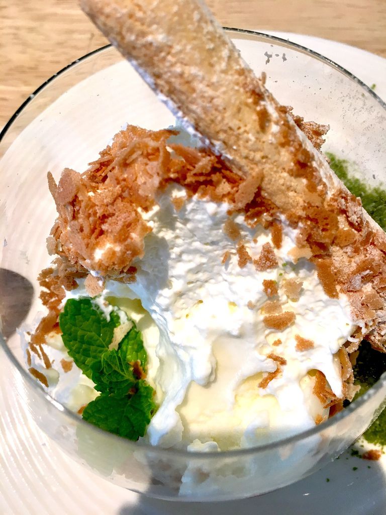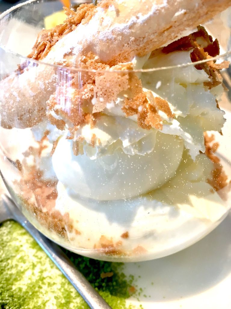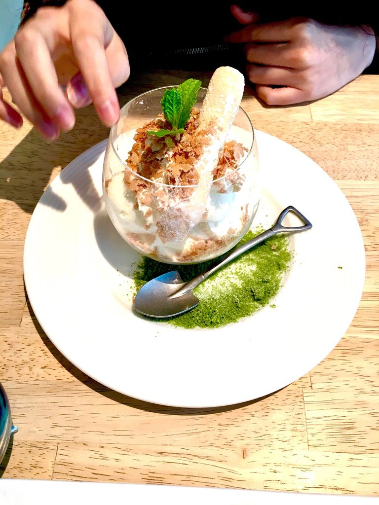 姑且稱之為北海道鮮奶酪盅,有興趣的朋友用照片點菜比較快XD 這碗還有脆片、餅乾,增添口感和微微的麵粉香,我喜歡這種平衡的設計;盤子上那一片很來以為是抹茶的是完全不一樣的東西,好像有糖霜但又不怎麼甜。