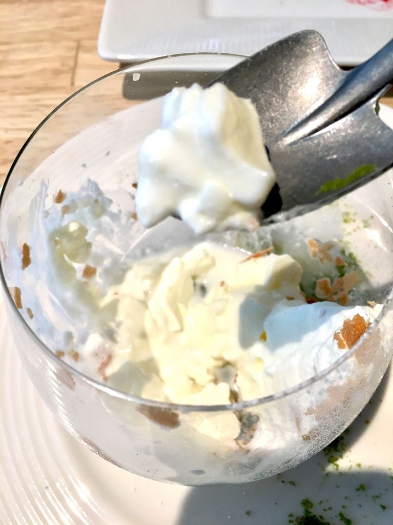 食用工具是小鏟子,怎麼會這麼可愛>皿< 這一碗公白白的東西有很多層次,他有鮮奶油、鮮奶冰淇淋、還有奶酪,把北海道鮮奶的清甜、清爽透過不同質地、溫度呈現出來,比起來我以前吃的鮮奶油/奶酪/冰淇淋都好甜膩,到底都吃了些甚麼?<br>
