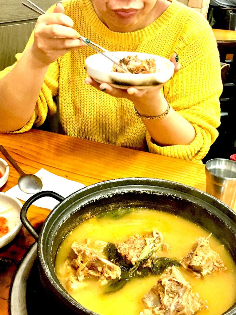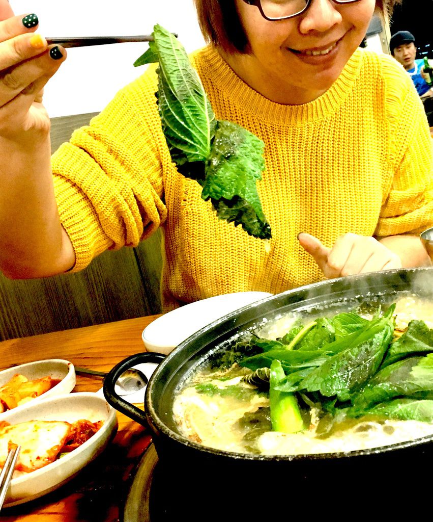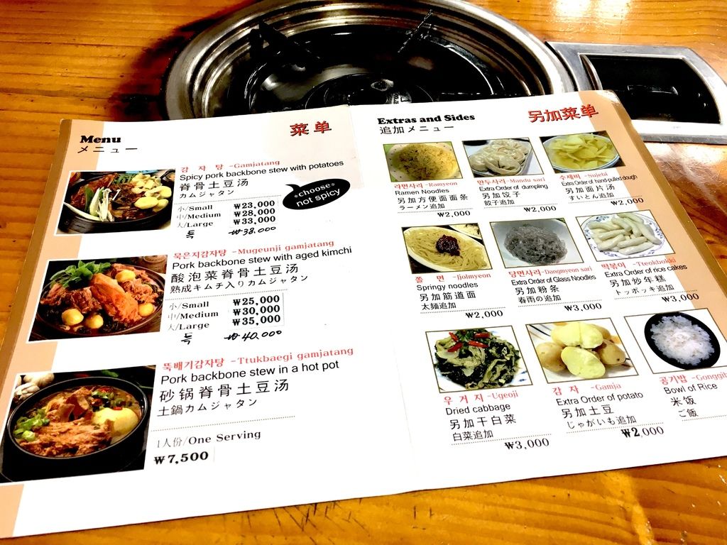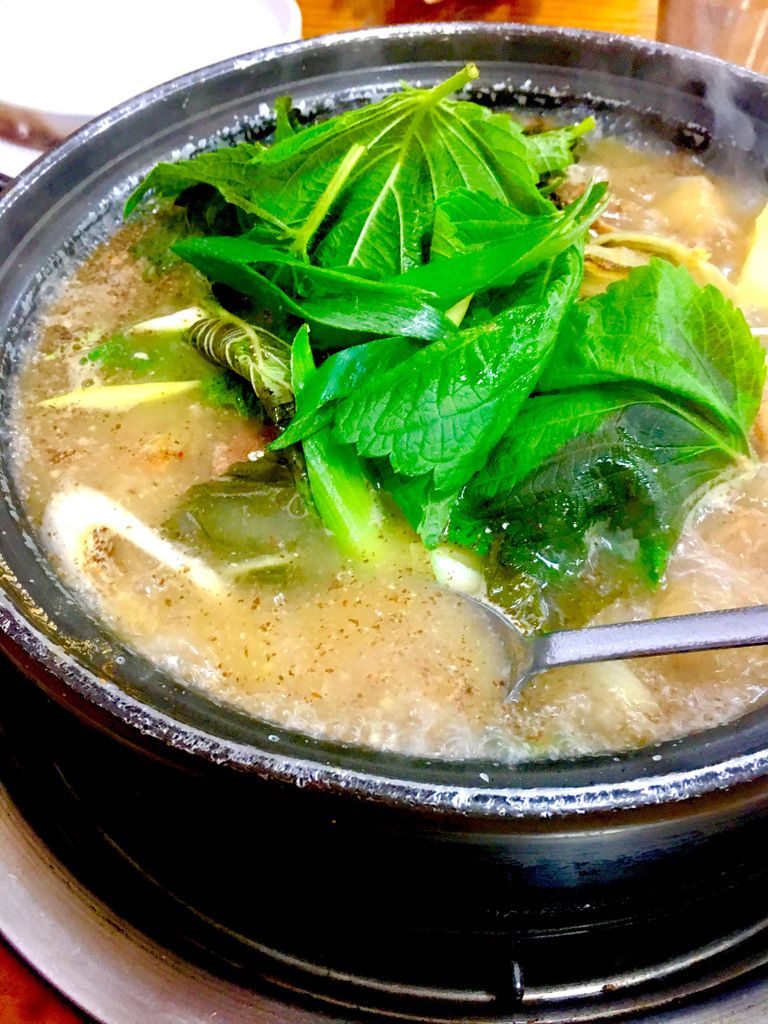 我們選了兩人份的馬鈴薯豬骨湯,加點水餃。小菜的部分沒有太深刻的印象,不過我喜歡韓國的泡菜,菜葉的質地很鮮脆,沒有那種醃很久的無力感,口味上跟台灣吃到的倒是差不多。豬骨湯上面有一從由蔬菜組成的綠冠,我從來沒吃過紫蘇葉當蔬菜煮湯,超好吃。 這鍋湯不簡單的地方,湯頭絕對是主要原因之一,湯裡有很多碎香料,完全吃不出是甚麼,喝完腸胃很暖和舒服。