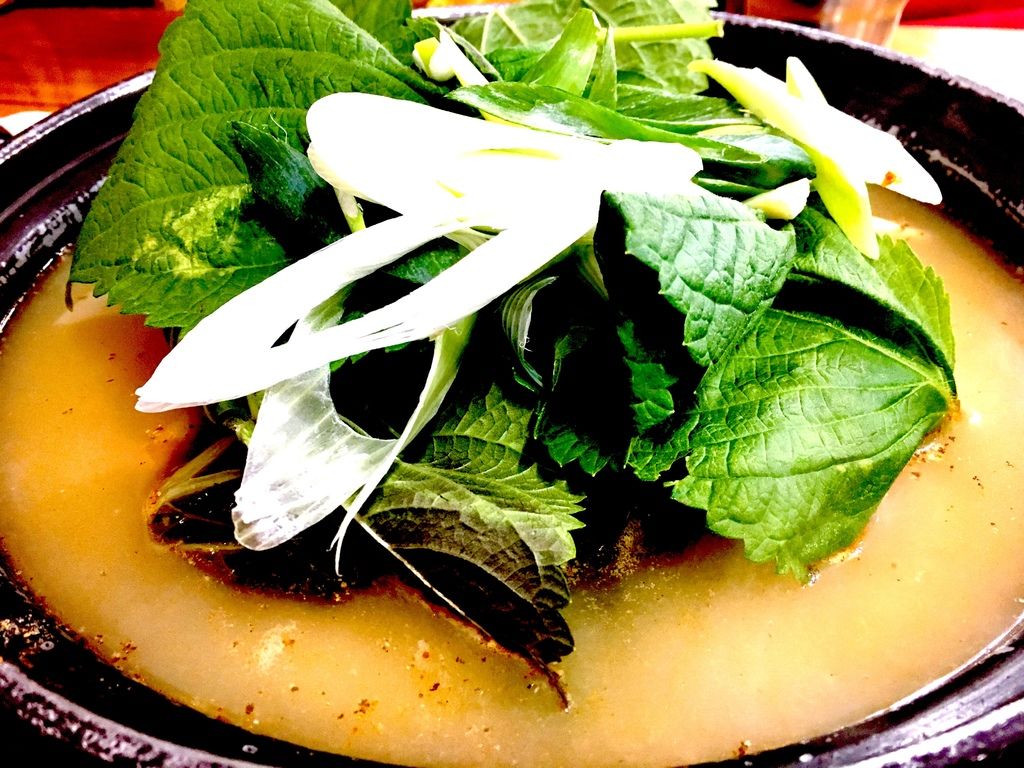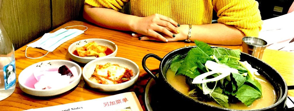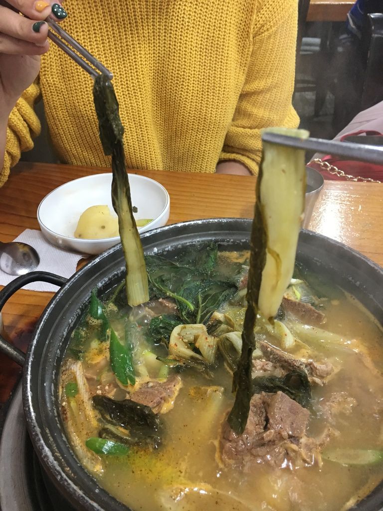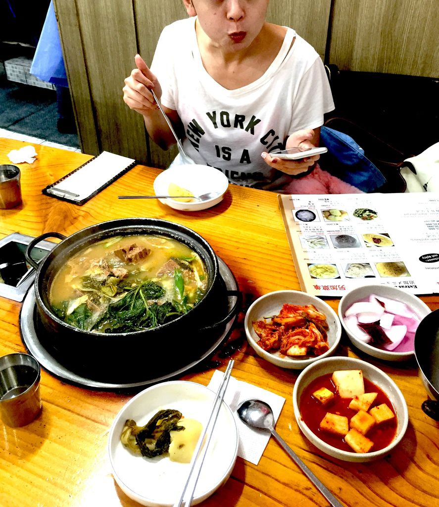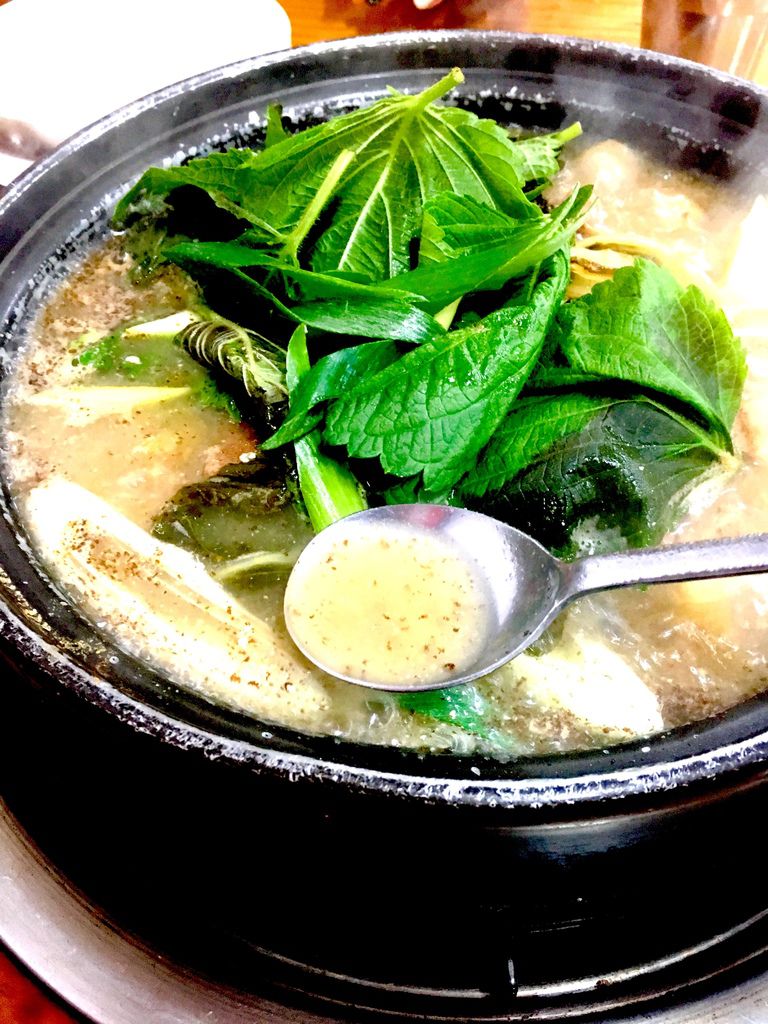 我們選了兩人份的馬鈴薯豬骨湯,加點水餃。小菜的部分沒有太深刻的印象,不過我喜歡韓國的泡菜,菜葉的質地很鮮脆,沒有那種醃很久的無力感,口味上跟台灣吃到的倒是差不多。豬骨湯上面有一從由蔬菜組成的綠冠,我從來沒吃過紫蘇葉當蔬菜煮湯,超好吃。 這鍋湯不簡單的地方,湯頭絕對是主要原因之一,湯裡有很多碎香料,完全吃不出是甚麼,喝完腸胃很暖和舒服。