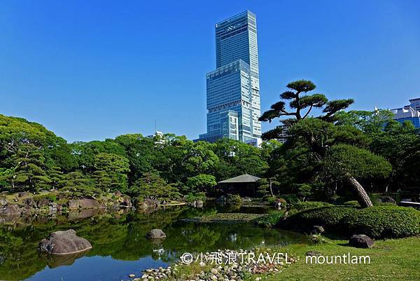 站在某些角度可以清楚看到後面的阿陪野大樓(日本最高的大廈), 最高的三層就是阿陪野展望台。高樓大廈與日本傳統庭園雖有非常大的對比, 卻在某一程度上相互融合在一起, 感覺十分特別。