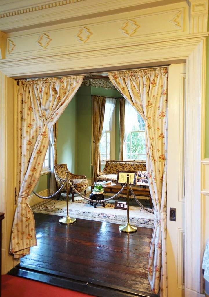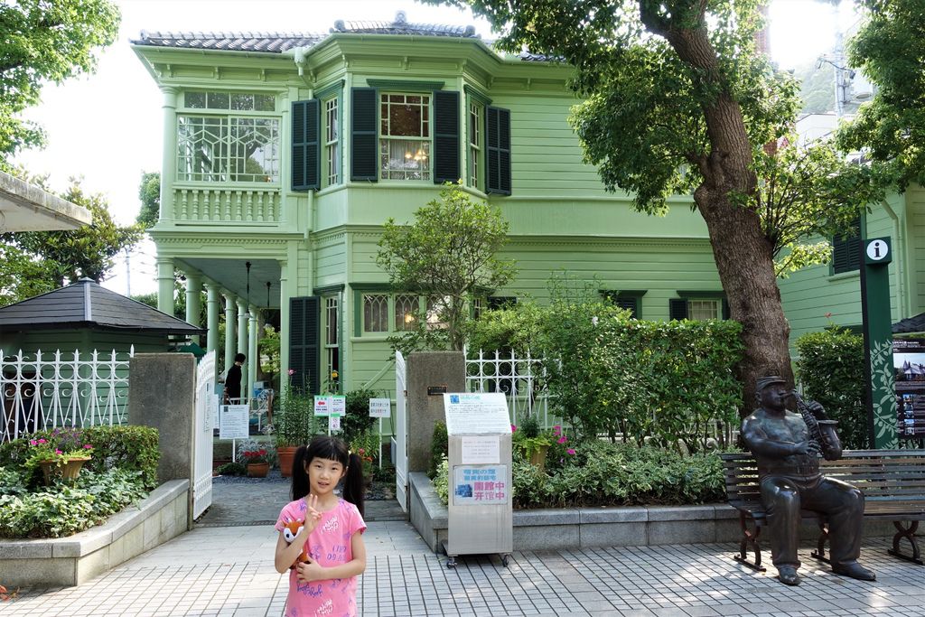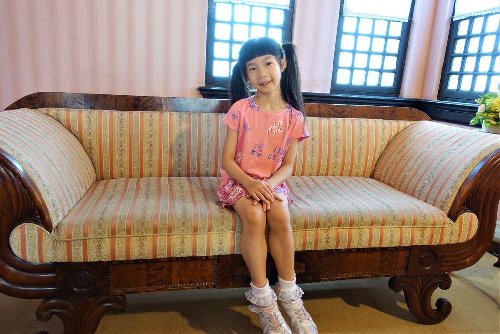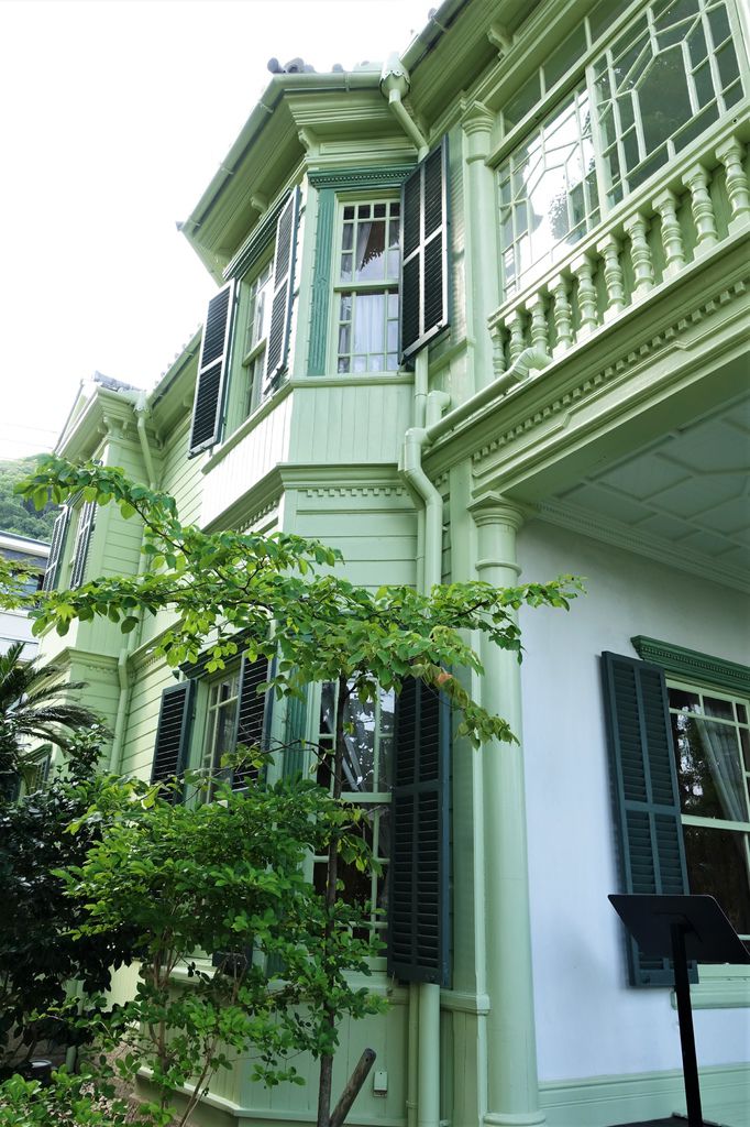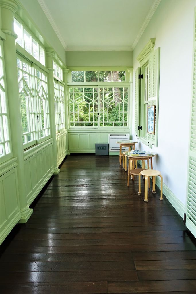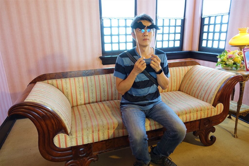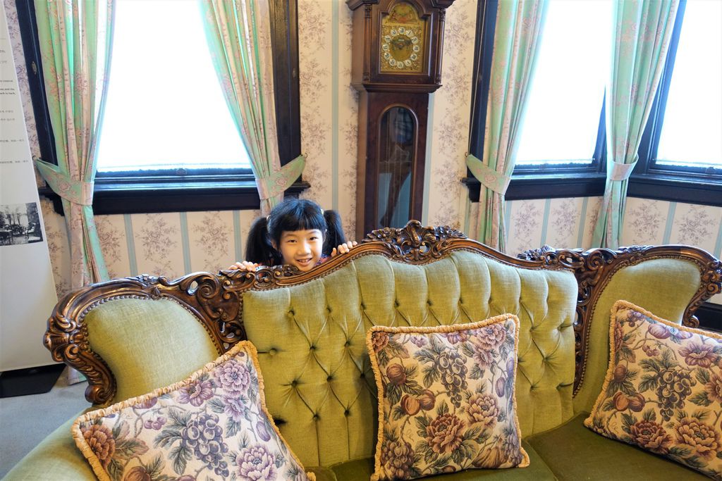離開歐風的「風見雞之館」,「萌黃之館」則帶領我們一窺美式建築風情。萌黃之館的前身是美國總領事的宅邸,建造完成時間比風見雞之館更早,在1903年。淡綠色的兩層樓外觀看起來很淡雅,很喜歡這種輕鬆的色調,感覺應該在前廊來杯下午茶,或跟閨蜜在樓梯上聊天(美劇看很兇)。小妞也很應景的拍了趣照。