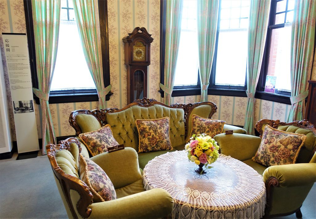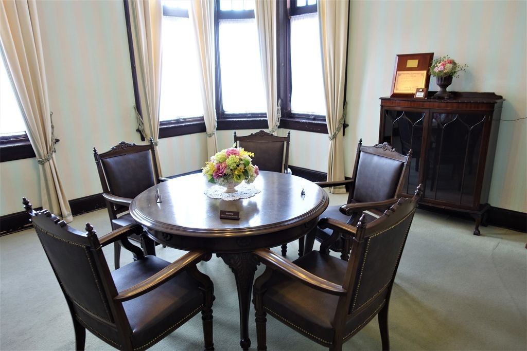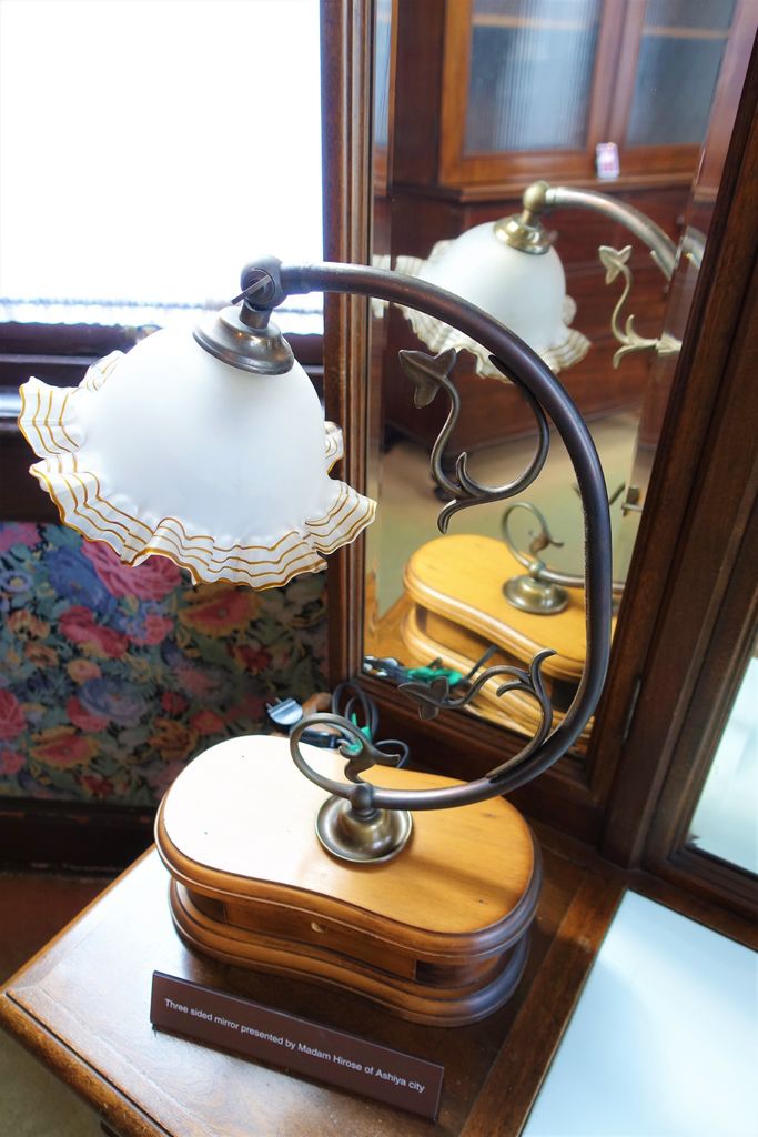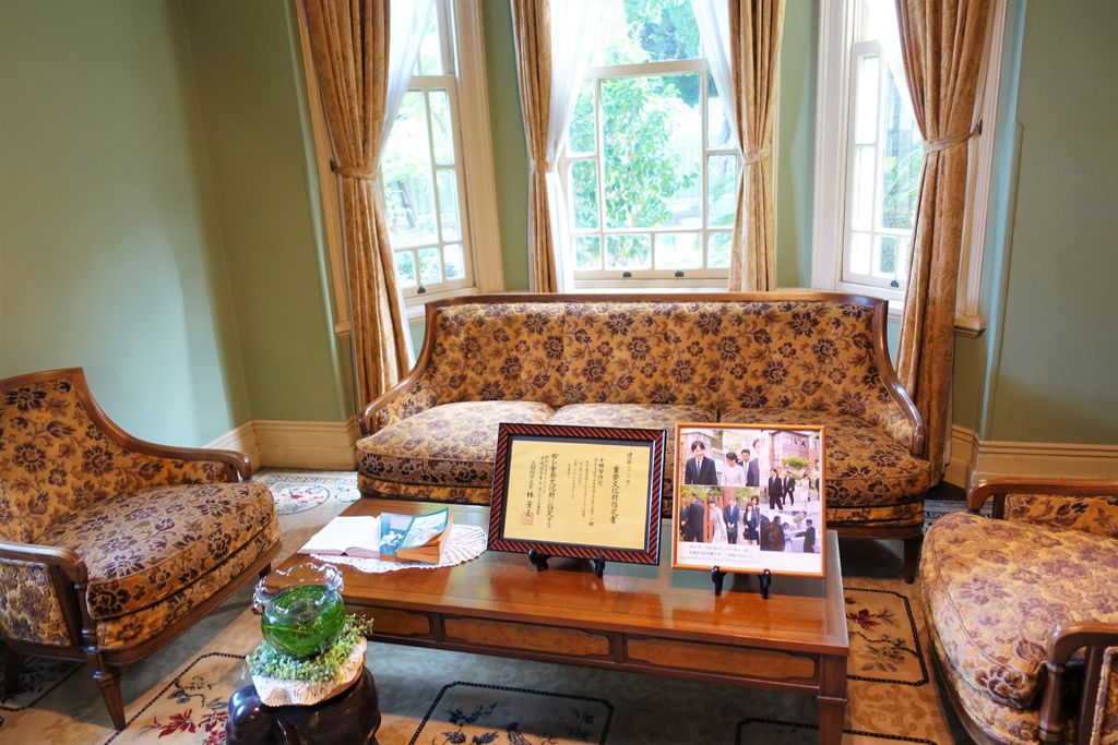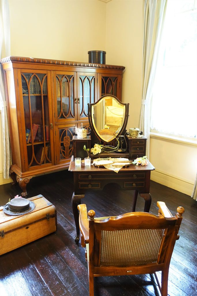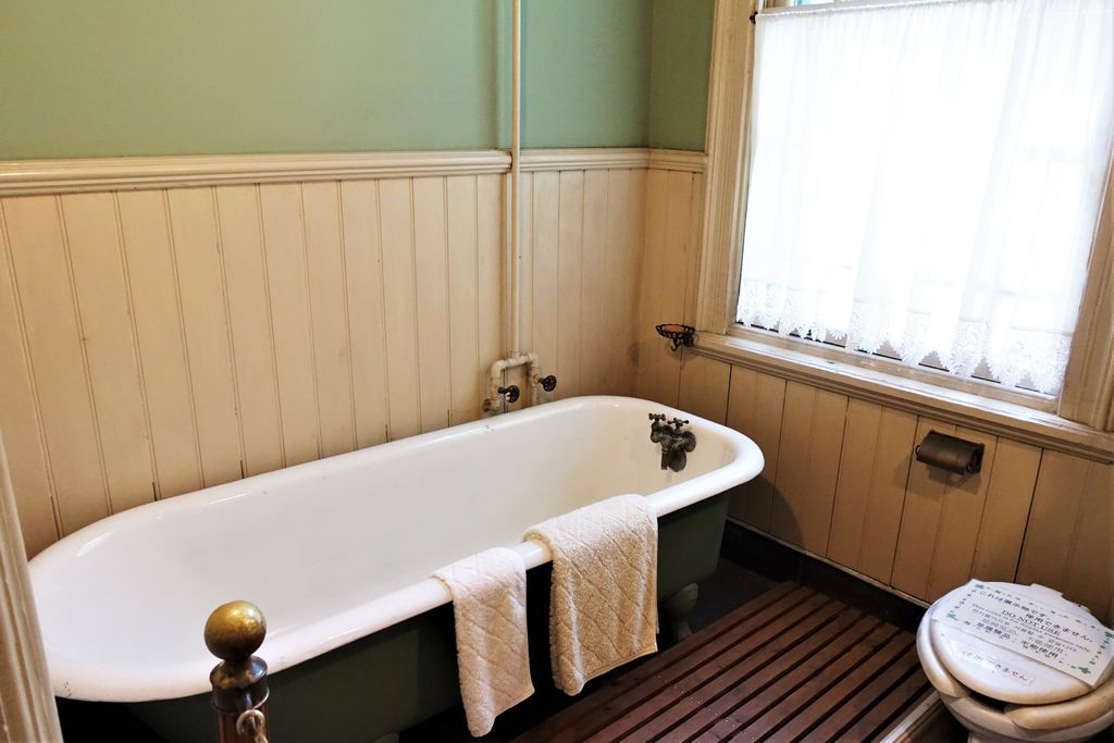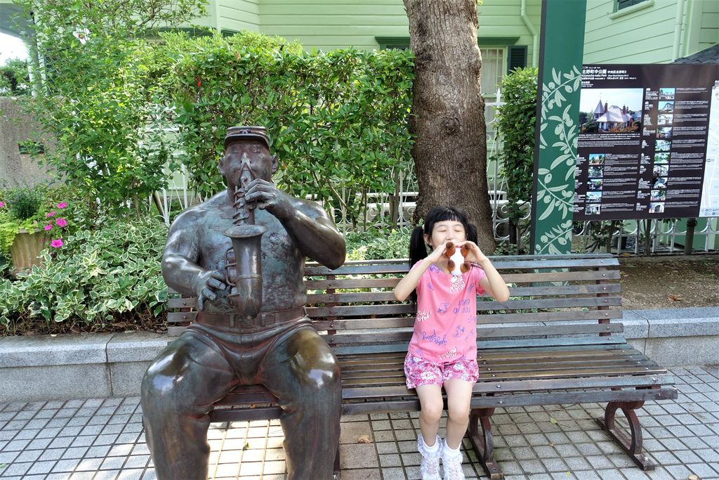 離開歐風的「風見雞之館」,「萌黃之館」則帶領我們一窺美式建築風情。萌黃之館的前身是美國總領事的宅邸,建造完成時間比風見雞之館更早,在1903年。淡綠色的兩層樓外觀看起來很淡雅,很喜歡這種輕鬆的色調,感覺應該在前廊來杯下午茶,或跟閨蜜在樓梯上聊天(美劇看很兇)。小妞也很應景的拍了趣照。
