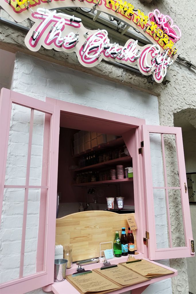 這家粉紅繽紛泡泡的店,是狗狗沙龍店!因為太可愛了,特別上網搜尋了一下,內裝好夢幻(最後一張圖片取自官網)。不過,一旁竟然還有販售飲料和酒,真是複合式經營,不確定主人能不能一起待在裡面陪伴,順便享用下午茶。只能說,選對主人的狗真是幸福啊!