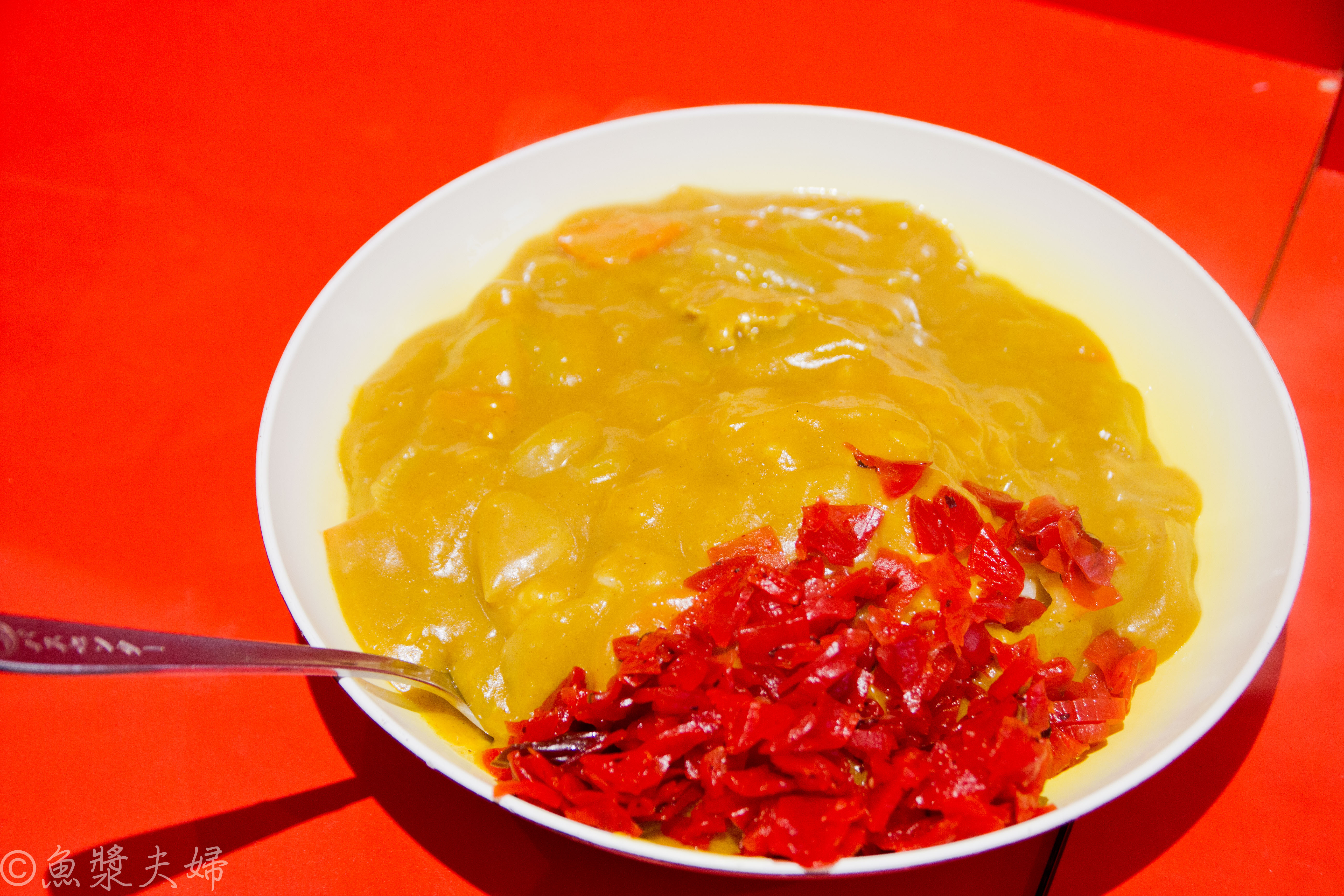 仔細一看,原來是白色盤子染上了薑黃的顏色,搭著上面的咖哩飯,看起來就像散發著靈氣一樣。