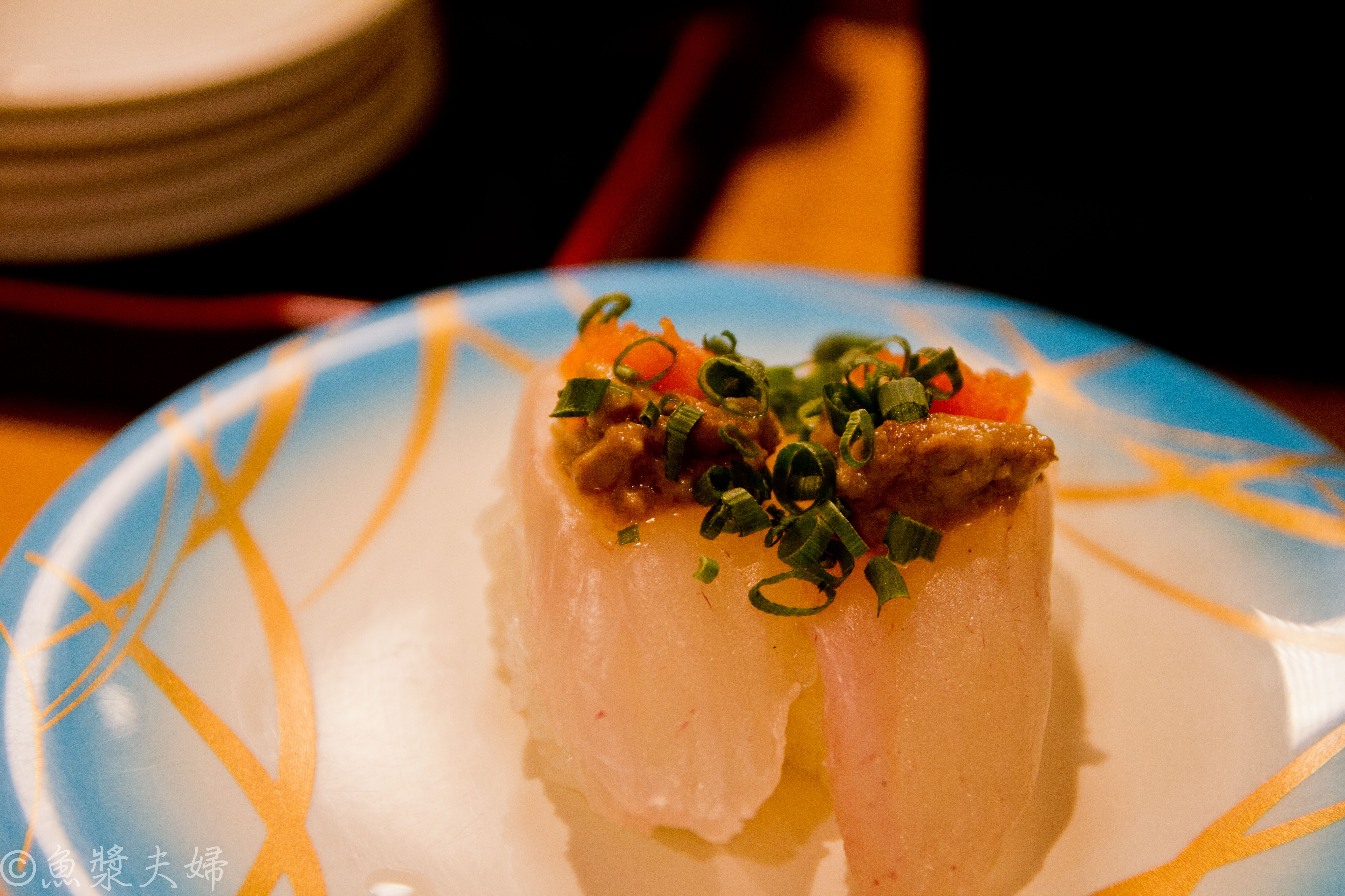 白身剝皮魚肉味淡搭上濃郁肝醬的巧妙互補,這裡也充分展現了迴轉壽司的缺點,放置轉盤的時間若較長一些,肝醬有些化水,味道不變,但口感有點拖泥帶水。