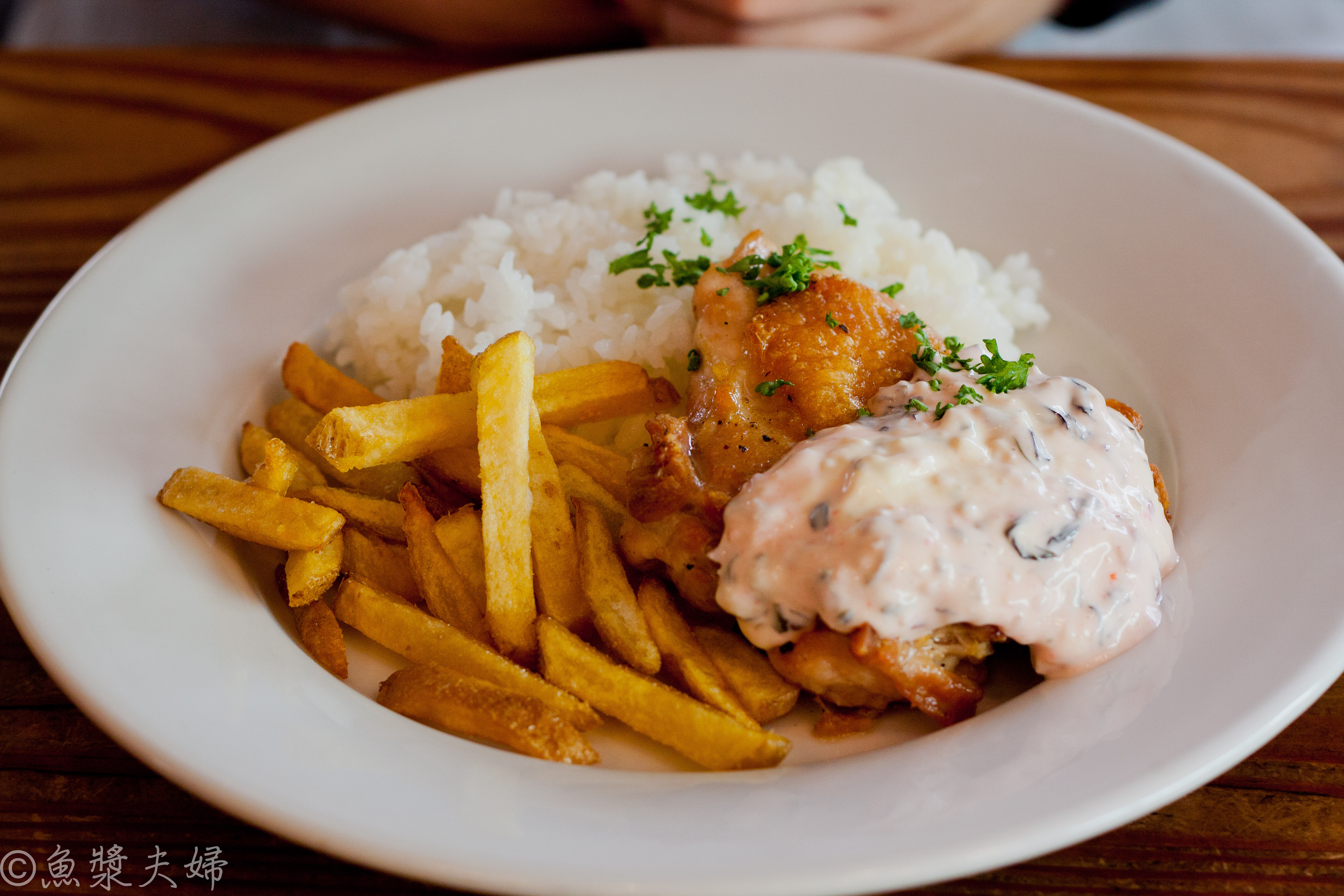 烤雞配柴漬塔塔醬,柴漬是把茄子醃出乳酸的氣息,有點像是把不甜的優酪乳調進了蛋沙拉裡。酸酸的茄子比起應該放酸黃瓜的塔塔醬,有一種柔和的溫醇感。