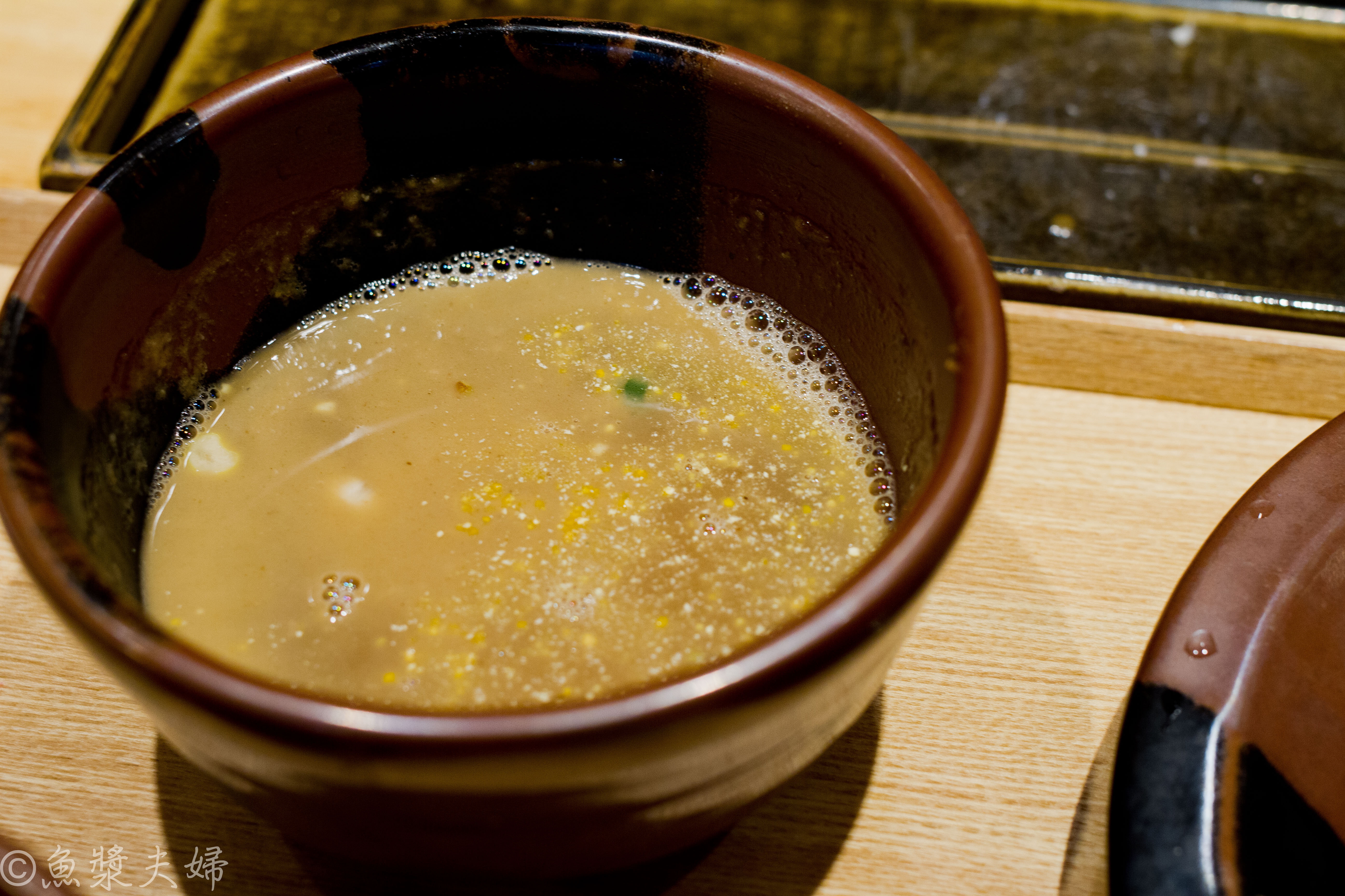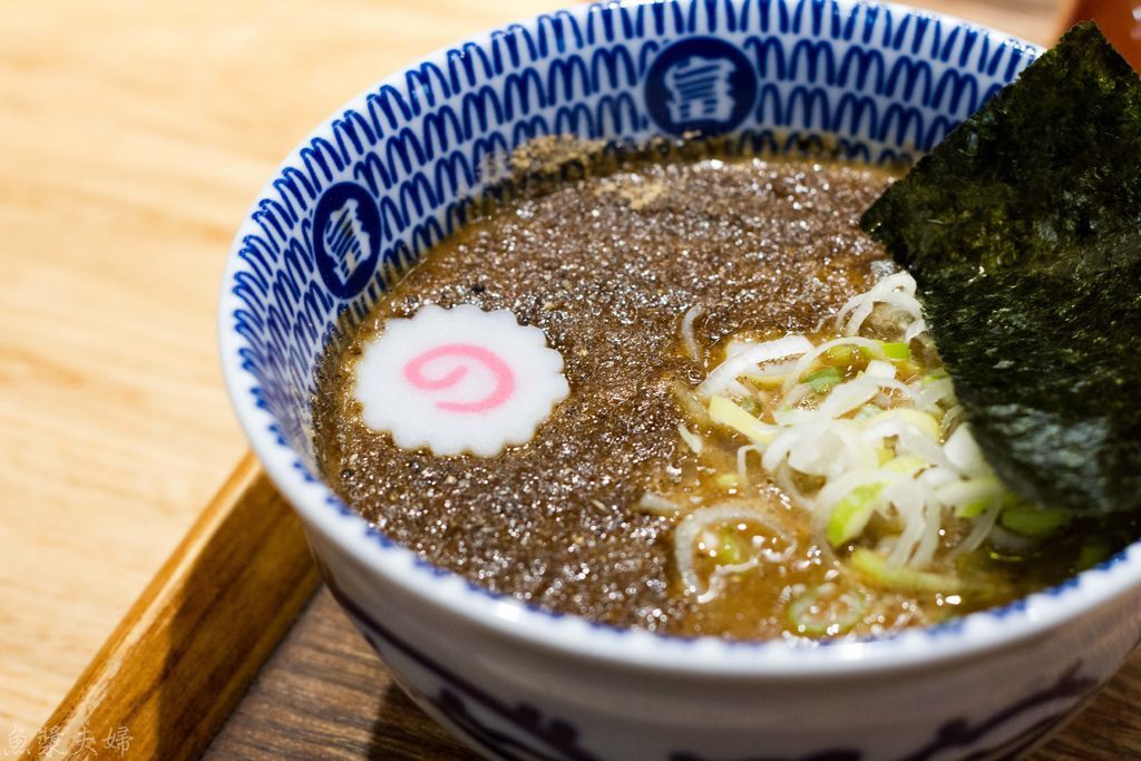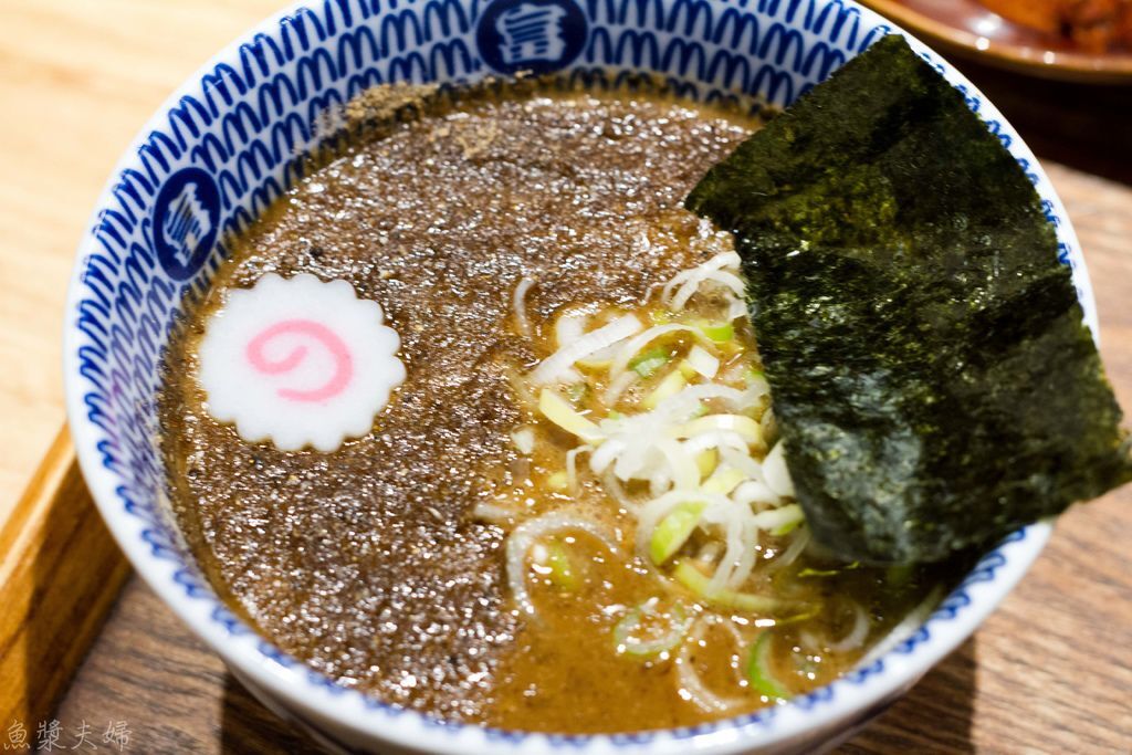 最近很喜歡用摺紙來形容拉麵的湯,如同真鯛麵魚,鯛魚帶來的本是清爽淡薄的魚湯之味,如同一張薄薄的紙一樣。但麵魚卻經過不斷的折疊,也折出了令人難忘的厚度來。但富田的沾湯卻不像摺紙,更像是三塊重厚的磚頭疊了起來,帶著厚度有十分沈厚。