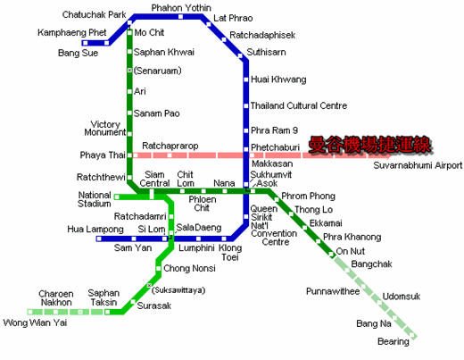 如果到市區要轉搭MRT線的朋友,可選擇搭乘至MAKKSAN站換乘;如欲轉搭BTS線,可選擇搭乘至PHAYA THAI站換乘。