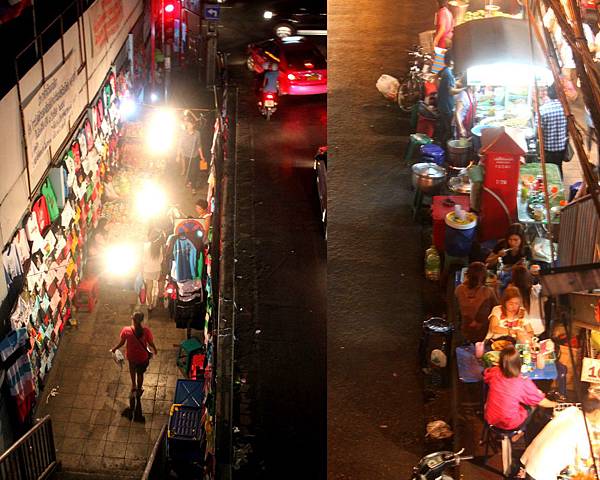 Ramkhamhaeng夜市是沿著The Mall 3這一邊的馬路發展而成,The Mall 3有著五彩繽紛閃耀霓虹燈的MAJOR CINEPLEX電影院,所以非常好認,人行道一邊是店舖,店家為了擴展店面,所以會搶占人行道上能用的空間,人行道另一側靠近馬路邊,攤商們也竭盡所能架設攤位,所以人行道上能走的空間實在很有限,兩個人並肩而行都有點困難,這也造成常常在路上”塞人”的奇觀。