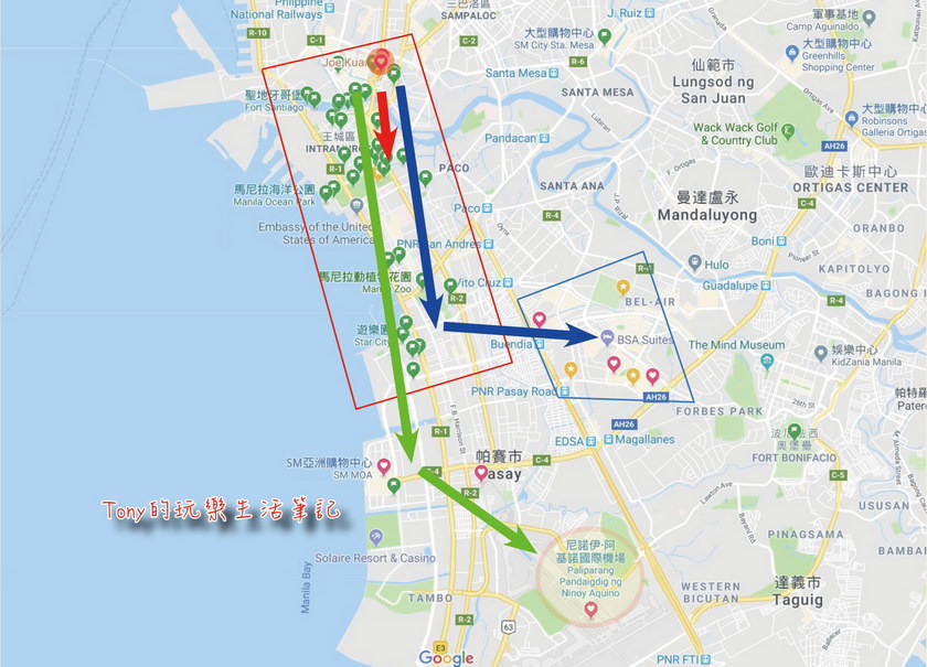 因為先查過了大家的文章,發現雖然大家都想說菲律賓治安不怎麼好,但在歷史古城的《王城區》與海岸景觀區(紅線框起來的區域)跟商業最熱鬧的《馬卡蒂 Makati》(藍線框起來的區域)