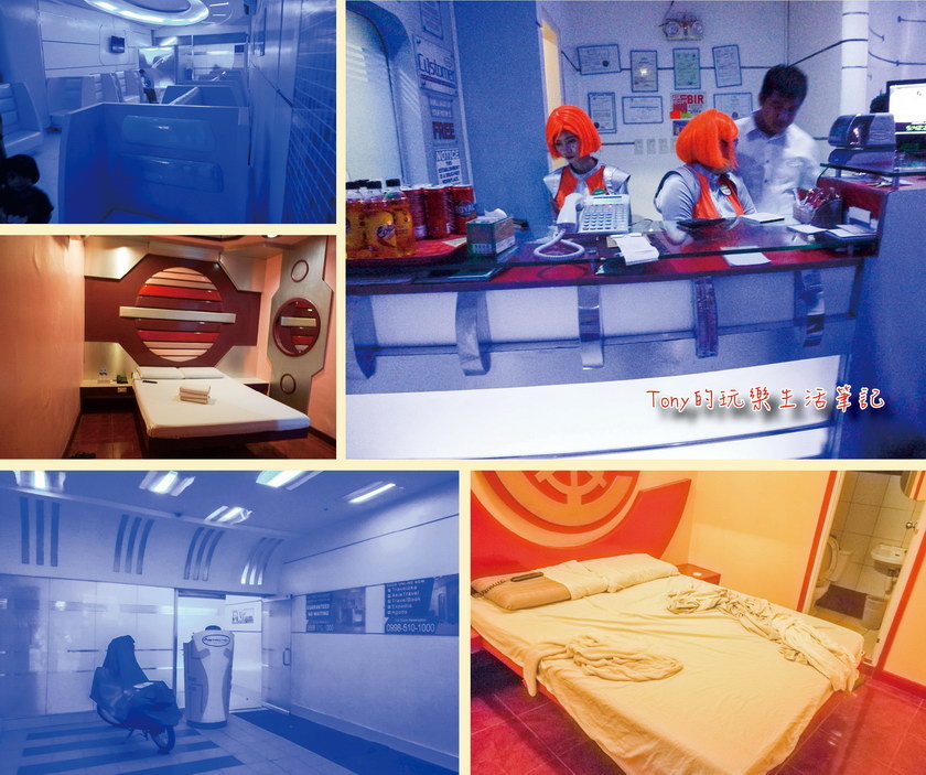 才剛到飯店門口,又是新的驚奇在等候。外面是三排的攤販市集,好不容易穿越進來,在飯店門口外有一群女人坐在路邊,一看到我們就馬上跟我講了一堆話,說真的,這對住在台灣萬華長大的我,超熟悉的,這是在拉客啊!不過還好她們只是揮揮手問一下,沒上來拉我們走。再來就是門口的警衛,就跟網路寫的一樣,年輕精壯的警衛,我偷偷看了一眼,還真是有帶槍的。走進去,一整個超藍的藍光色調,還放著星戰音樂,連櫃檯的招待妹妹都有著很特異打扮,很妙,又是一個驚奇。而最驚奇的是,當服務生帶我去房間,一打開門,竟然是剛剛才“戰爭”結束,櫃檯跟清潔員竟然沒有核對清楚。服務生只好先請我再回到櫃檯等候,他去幫我調整換房。這時我在櫃檯前面等候時,才發現這邊進進出出的“情侶”很多,流動速度有快的,反而我一個人在那邊等候,一直受到他們奇怪的眼光注目,感覺我怎麼可能是一個人的﹖大概過了快二十分鐘,才總算給我一間乾淨的房間。