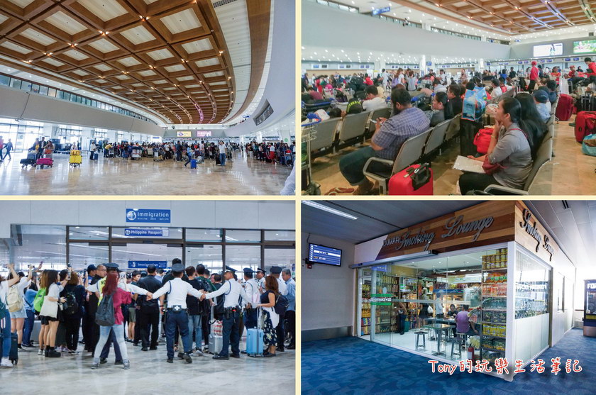 到了馬尼拉第一航廈,又是陣陣驚奇。先是要拿出護照才能進機場大廈,再走一小段長廊,馬上就是驗行李了。整個作業方式跟我到其它國家完全不同的。而我也是第一次被沒收了打火機,原來馬尼拉機場是完全不能帶打火機進機場的(那要吸煙的人怎麼辦﹖該不會都不能抽煙了吧﹖)。然後就是得等到起飛前3個半小時才會領取登機證,而這段時間,在大廳內完全沒得買吃的喝的啊!只能枯等了,誰叫我們太早到了。而這天又遇到可能是某個明星要離境吧﹖一群人尖叫拍照,不過這陣仗比起我們台灣追星又小太多了。只是真的看不出來到底是哪一個人,只看到一堆工作人員跟警衛包圍著保護。最後才終於領到登機證,可以進關去找吃的。在這邊又被機場清潔員用不太流利的中文問我們是否是要吸煙﹖然後帶我們去右下角的超商前面,叫我們進去到最裡面,那邊就是吸煙區了,還偷偷塞了一個打火機給我(好熱心啊!)不過吸煙區裡面就有好幾個打火機,只是都被鐵鍊綁起來了,拿不走的。後來出了吸煙室,那群清潔員還在門外等候我們,這時我還了他打火機,然後他跟我說了幾句“小費”,哈,原來他們是在等我們給小費啊!我身上剛好已經都把一些沒用完的錢都換成了美金了,最後還剩一張50披索紙鈔沒換到,就塞給他了,看來就算要離境,還是留幾張20元披索的小鈔備用的好