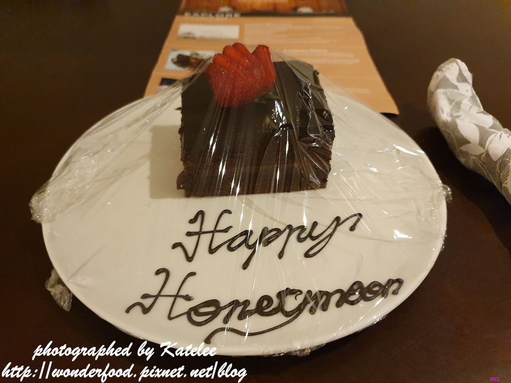 桌上還為我們準備了草莓巧克力蛋糕,寫上Happy Honeymoon