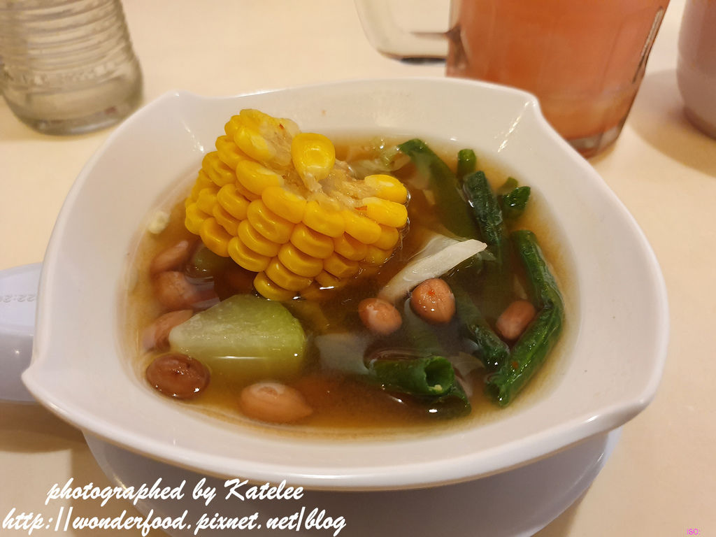酸酸甜甜鹹鹹的湯頭,浮著玉米、豆豆、高麗菜、花生等料