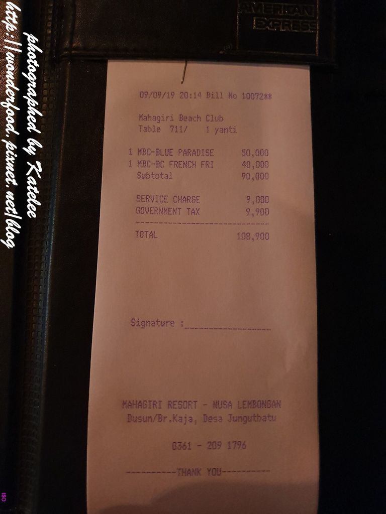 薯條和調酒加服務費共108900Rp,約台幣270元左右