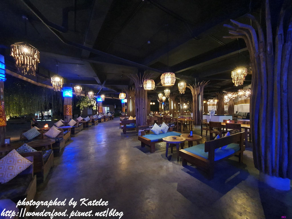 晚上的用餐區點起了昏暗的藍燈和黃光