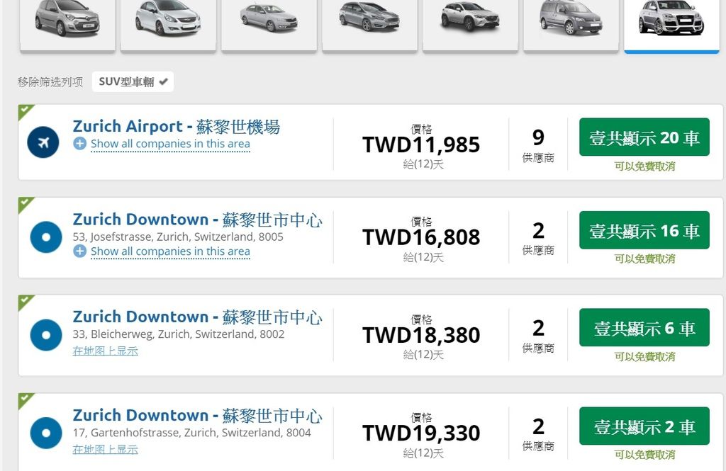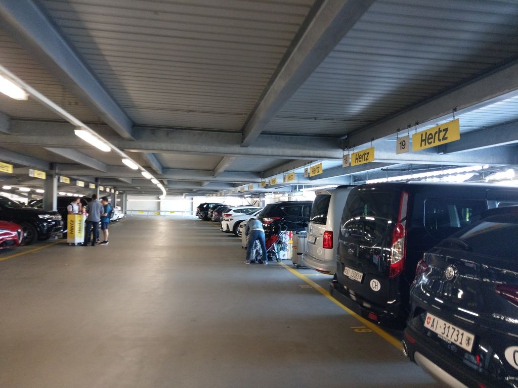 出發前,我只在加拿大、奧地利跟紐西蘭租車自駕過,因此一直把印象停留在機場取車比較貴的印象中(應該大部分的人都是如此),實際比價之後才發現事實並非如此,如圖下所示。瑞士租機場取車並未如有些國家租車需要收取 Concession Recovery Fee ,意即在瑞士租車於機場取車不僅費用比較便宜,而且大多數知名的租車公司都有設點,櫃台辦好相關手續就可以到隔壁停車場取車(真的就是在隔壁),簡直來個無縫接軌啊。還車時更簡單,直接跟著 "Rental Car Return, P3" 指標把車開到機場的 P3 停車場,依照自己的租車公司指標前進,接待人員檢查車況列印出收據後,直接搭電梯下樓辦理登機,再次無縫接軌。