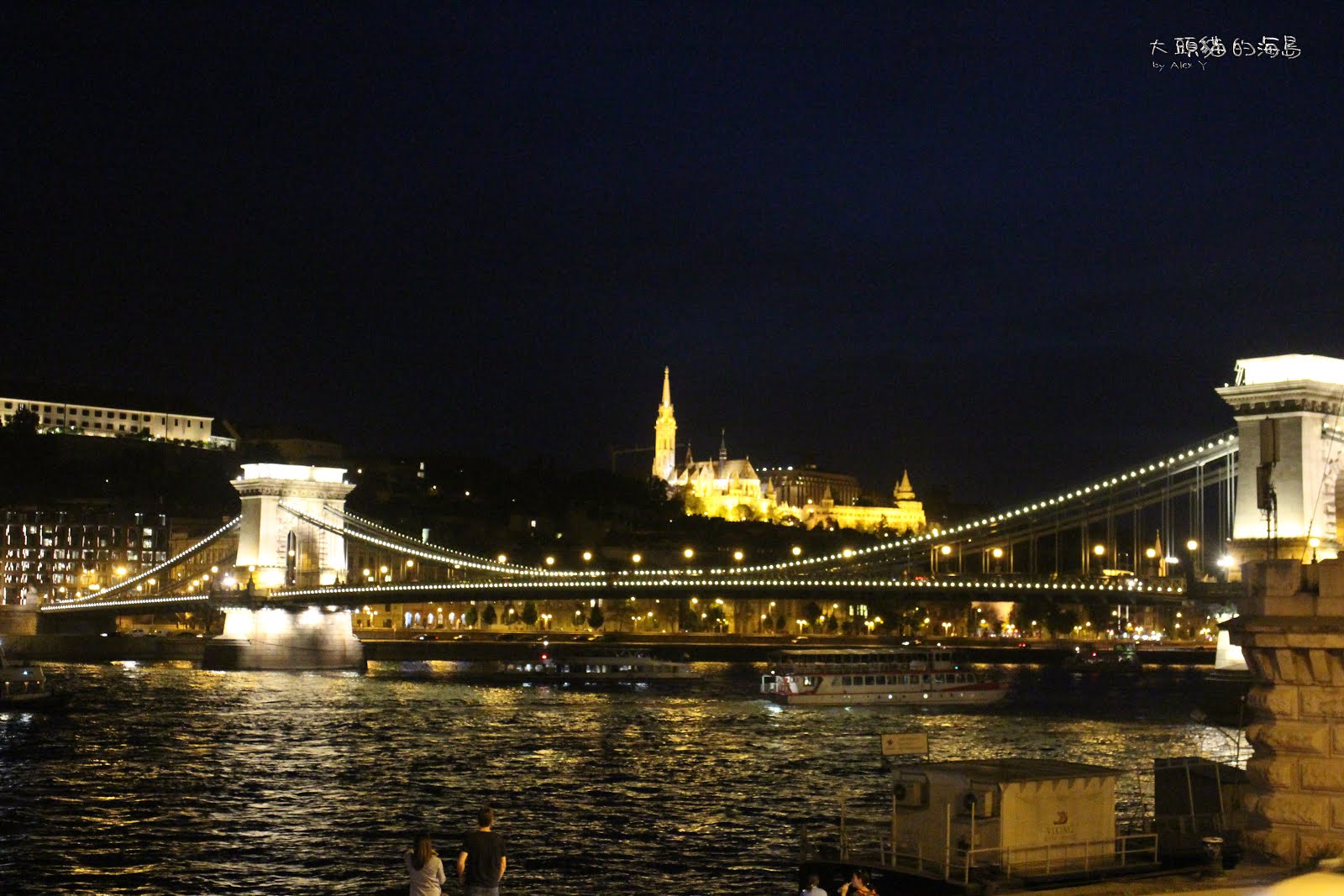 跨在多瑙河上亮晶晶的鎖鏈橋(Chain Bridge), 背後還有馬提亞斯教堂(Matthias Church)~