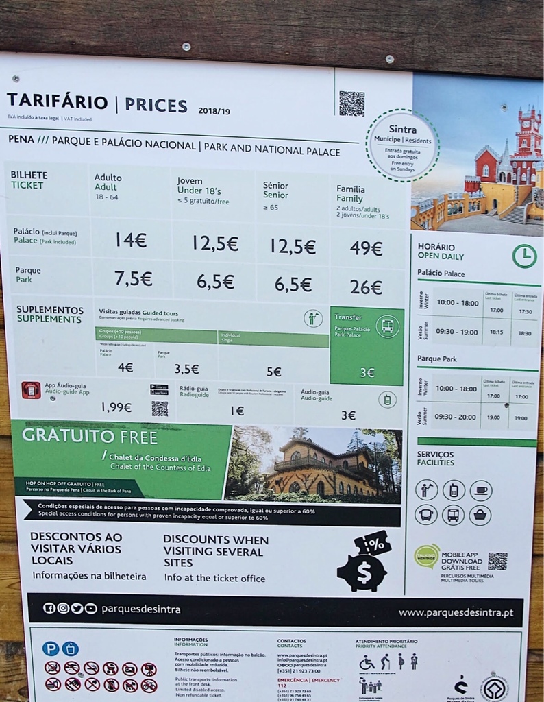 進入佩納宮的門票費用,門票又有分只參觀公園的,和參觀公園+宮殿兩種票價
