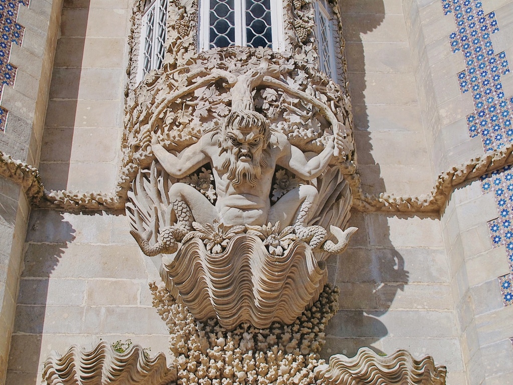 入口上方的雕刻便可感受到濃濃曼努埃爾式風格,在貝殼中的人物是希臘神話裡的海中信使Triton特里頓,