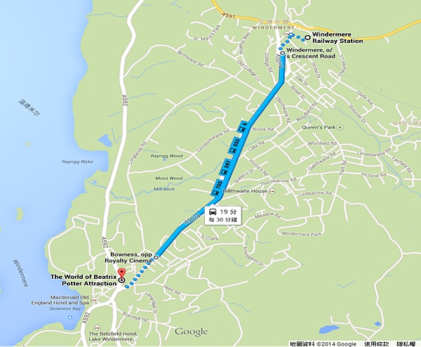 很多公車都有到 The world of Beatrix Potter Attraction,車程約15分鐘 (單程£1.9)。