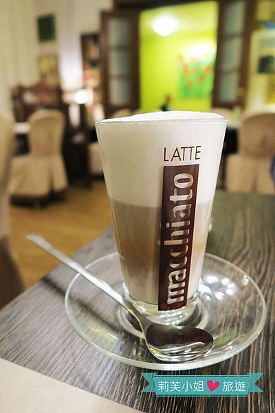 在歐洲餐廳都會點杯隨餐飲料,於是便試試看義大人調製的拿鐵吧!看到迷你的杯子,還以為這杯是espresso濃縮咖啡,不過服務生特地強調這杯是拿鐵無誤。喝起來苦甜參半,上頭細緻的奶泡綿密又順口。