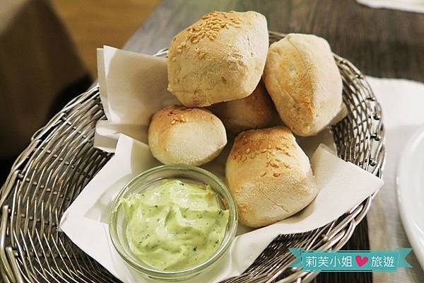餐前麵包是Pagana自家手作,看似平凡的小圓麵包,上頭灑上無數顆白芝麻增加香氣。很喜歡這種蓬鬆氣口的歐式麵包,沾點清爽的酪梨奶油醬一起入口更好。