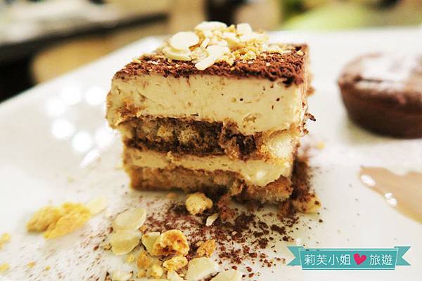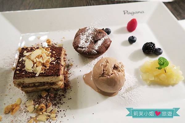 店家將兩項甜點擺在一起,視覺效果很好。提拉米蘇是義大利的國民甜點,也是我很愛的甜食之一。有別於其他間外型鬆軟,Pagana的提拉米蘇顯得堅固些,上頭灑落無數穀片和杏仁片,搭配混著甜酒的海綿蛋糕及奶油入口,同時吃到酥脆及濕潤的滋味。